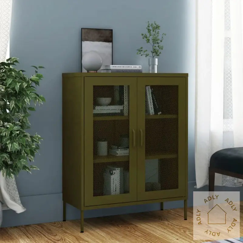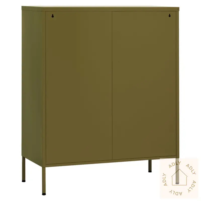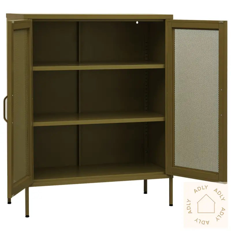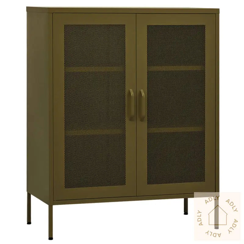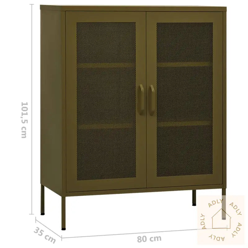 Farge: olivengrønnMateriale: stålMål: 80 x 35 x 101,5 cm (L x B x H)Høyde ben: 15 cmAntall hyller: 2Lastekapasitet per hylle: 30 kgTotal lastekapasitet: 90 kgMed benutjevnere på bunnen for ekstra stabilitetMontering kreves: ja