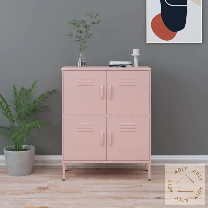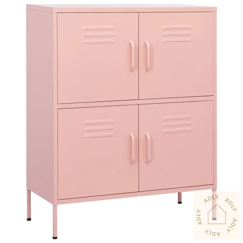 Farge: rosaMateriale: stålMål: 80 x 35 x 101,5 cm (B x D x H)Med 4 dørerMed 2 justerbare hyllerMed benutjevnere på bunnenMontering kreves: jaADVARSEL: For å forhindre at produktet velter, må medfølgende festemidler for vegg benyttes