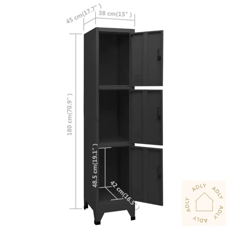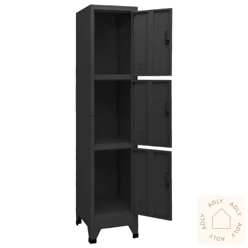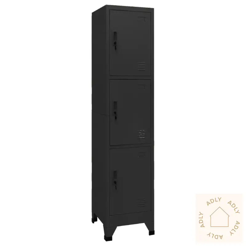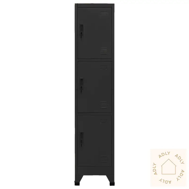 Farge: svartMateriale: stålMål: 38 x 45 x 180 cm (B x D x H)3 låsbare dører (2 nøkler inkludert for hver dør)Med luftventiler og navnelappholdere på dørerLastekapasitet per rom: 20 kgTotal lastekapasitet: 60 kgMontering kreves: jaADVARSEL: For å forhindre at produktet velter må de medfølgende festene for vegg brukes