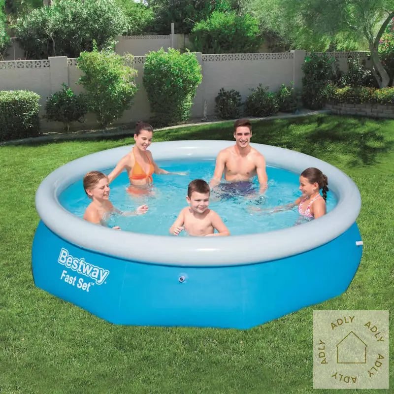 Mål: 305 x 76 cm (Diameter x H)Kapasitet (80%): 3800 LForsterkede 3-lags vegger for ekstra holdbarhetStabilitet fra oppblåsbar toppringInnebygd dreneringsventil for enkel tømmingUndervannsreparasjonslapp inkludertLettvint montering og demonteringBestway varenummer: 57266