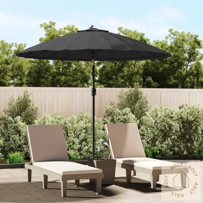 Farge: svartMaterialer: stoff (100% polyester), aluminiumSamlet mål: 270 x 246 cm (Diameter x H)Diameter stang: 38 mmMed sveivesystemInkludert 24 spilerMontering kreves: ja