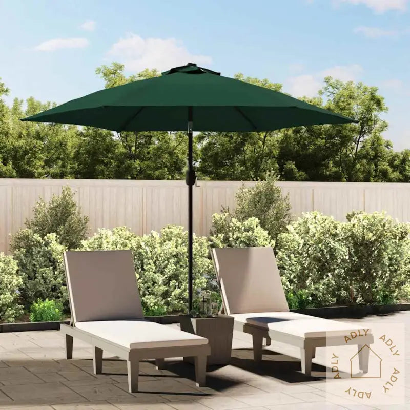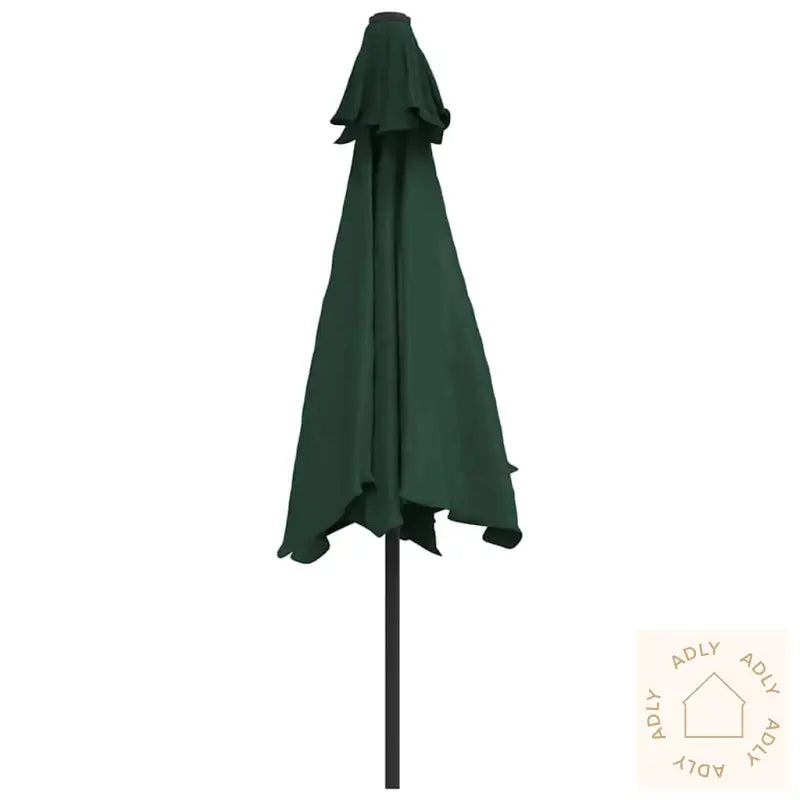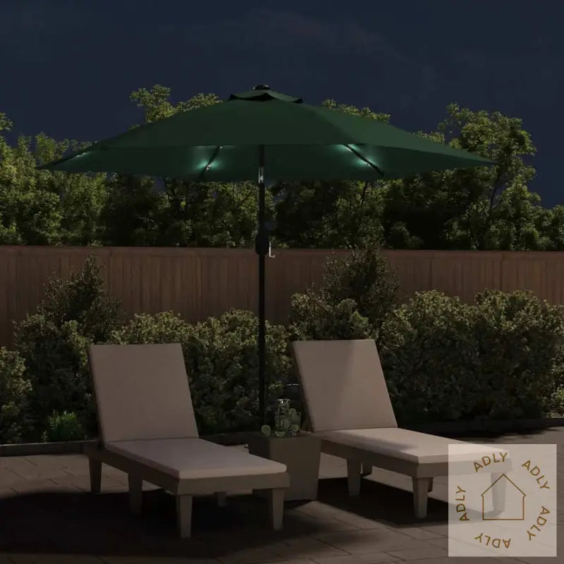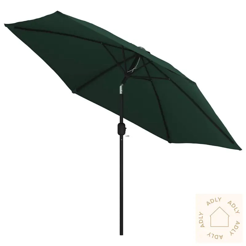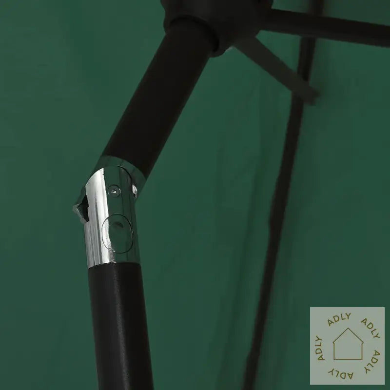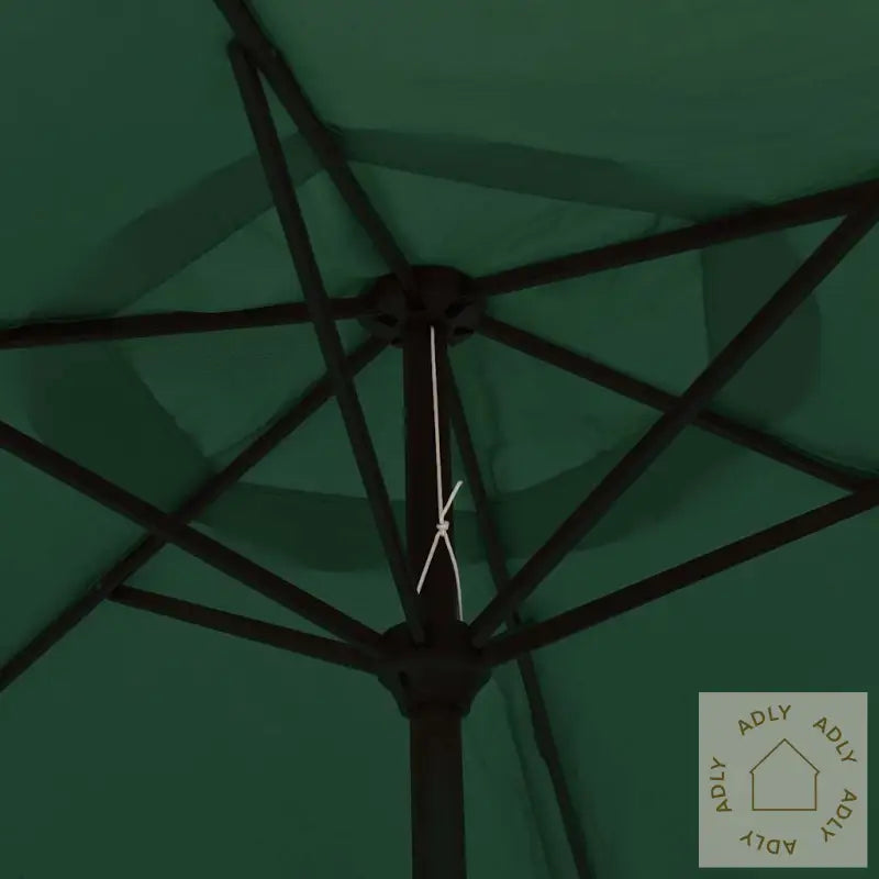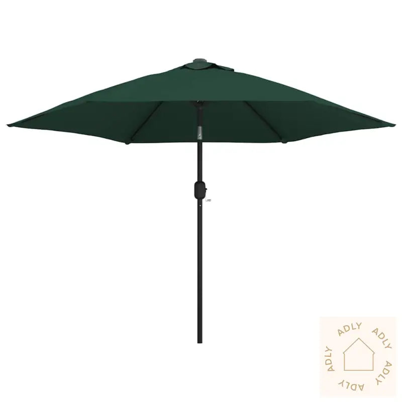 Skjermfarge: GrønnSkjermmateriale: PolyesterSkjermdiameter: 3 mHøyde: 2,25 mMateriale armatur: stålramme med svart pulverlakkert finishStang med to seksjoner: 38 mmMed sveiv og vippemekanismeMed 18 soldrevne LED-lysMed 6 stålspilerEnkel ventilering (ingen klaff)Fritthengende designHengende parasoll med sveivVindtettGod ventilasjon og UV-beskyttelseGod belysning på kveldenStoff: Polyester: 100%