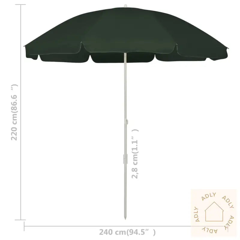 Farge: grønnMateriale: polyesterDiameter stang: 28 mmTotal høyde: 220 cmDiameter parasoll: 240 cmVær- og UV-bestandigVippbarMontering kreves: ja