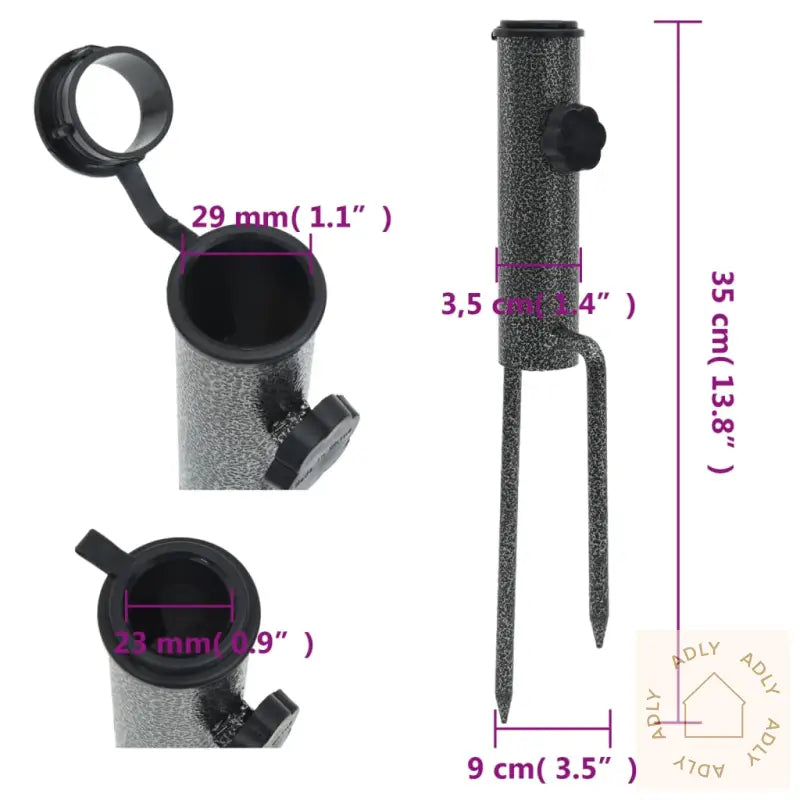 Mange bruksområder: Dette fleksible parasollstativet fungerer ikke bare til vanlige parasoller, men også til fiskeparasoller, hageparasoller og andre produkter som må stå oppreist for å brukes effektivt ute eller i hagen. Et smart valg blant hagemøbler for deg som vil ha fleksibilitet hele sommeren.Farge: svartMateriale: galvanisert stål – ekstra motstandsdyktig mot vær og vindSamlet mål: 9 x 35 cm (L x H)Ytre diameter rør: 35 mmIndre diameter rør: 23/29 mmPasser til paraplystangstørrelse: 28/32 mmLeveransen inneholder:2 x parasollstativer