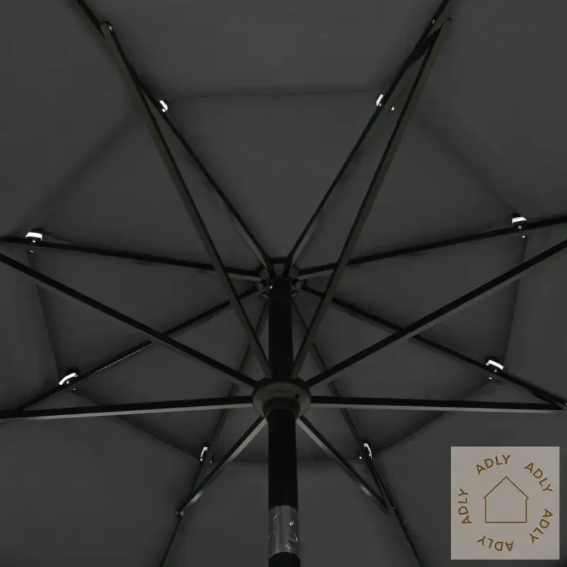 Farge: antrasittMaterialer: polyester, pulverlakkert aluminiumSamlet mål: 350 x 260 cm (Diameter x H)Diameter stang: 48 mmInkluderer 8 aluminiumsspiler