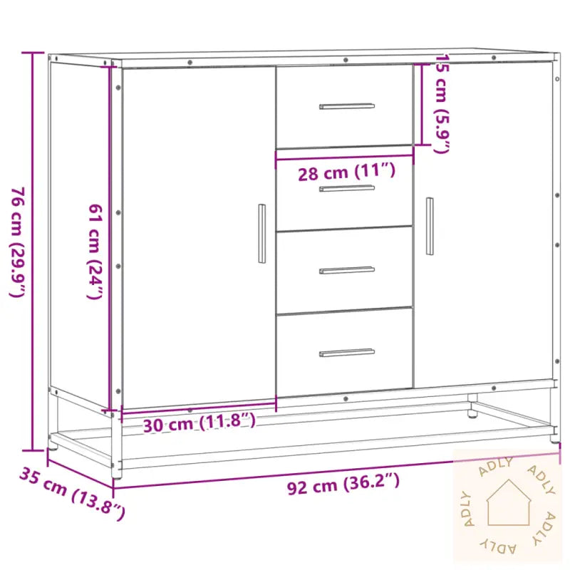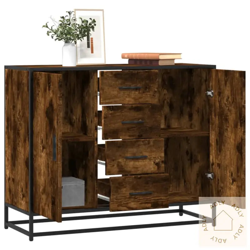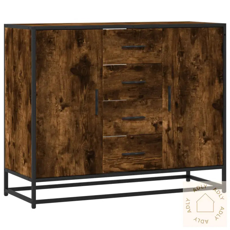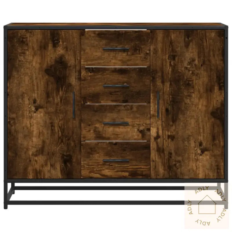 Stabilt og slitesterkt materiale: Konstruert tre gir en solid base, mens den jevne overflaten er motstandsdyktig mot fukt og enkel å rengjøre. Perfekt for hverdagsbruk blant alle dine møbler.Slitesterk og stilig ramme: Den sterke metallrammen gir holdbarhet og trygghet, samtidig som du får en kul, industripreget touch på rommet.Rikelig med lagringsplass: Med fire praktiske rom med dør og fire skuffer får du nok plass til å oppbevare alt fra servise til småting og daglige nødvendigheter. Holder hjemmet velorganisert og ryddig.Allsidig bruk: Passer like godt i stue, soverom, gang eller oppholdsrom – skjenken gir deg fleksible oppbevaringsløsninger uansett hvor den plasseres.Lettstelt overflate: Den glatte finishen gjør at støv og smuss enkelt tørkes bort, noe som gir deg mer tid til å nyte møblene dine uten bekymring for vedlikehold.Sikkerhetstips: For å forhindre at møbelet velter, anbefales det å bruke den medfølgende festeanordningen.