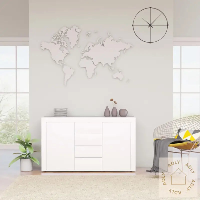 Med 2 dører og 4 skuffer tilbyr denne skjenken rikelig plass for å holde bøker, bokhyller og stående hyller organiserte, lagre multimediautstyr eller andre eiendeler på en ryddig måte. Den solide bordplaten gir god plass til dekorative elementer, familiebilder eller potteplanter som kan gi personlig preg på innredningen. Skjenken er laget av høykvalitets konstruert tre, noe som gjør den solid og holdbar over tid – samtidig som overflaten er enkel å holde ren med bare en fuktig klut.