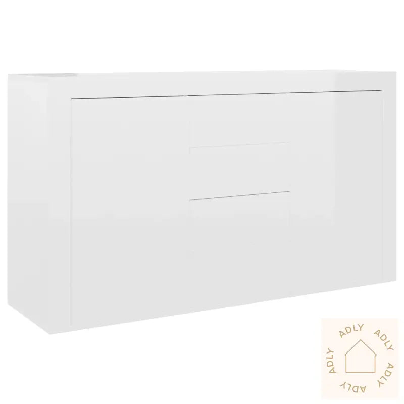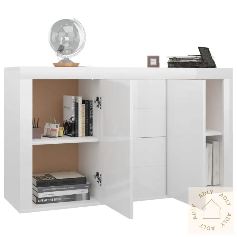 Farge: høyglans hvitMateriale: konstruert treMål: 120 x 36 x 69 cm (B x D x H)Med 2 dører og 4 skufferMontering kreves: jaADVARSEL: For å forhindre at produktet velter, må medfølgende festemidler for vegg brukes.