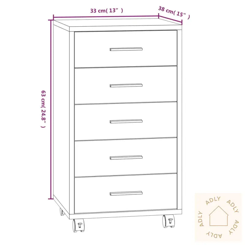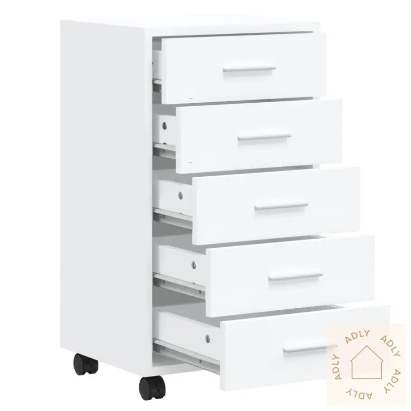 Skapet er laget av slitesterkt konstruert treverk i høy kvalitet, med en glatt og elegant overflate. Materialet gir både styrke og stabilitet, og motstår fuktighet – ideelt for daglig bruk på hjemmekontoret eller i arbeidsrommet.Med fem romslige skuffer gir dette oppbevaringsskapet deg god plass til å holde orden på alt fra dokumenter og notatbøker til penner, binders og andre småting du trenger lett tilgjengelig. Dette gjør det enklere å organisere og holde arbeidsplassen ryddig.Fire hjul – hvorav to med bremser – lar deg flytte skuffeskapet enkelt rundt i rommet etter behov. Det betyr at du kan tilpasse arbeidsområdet ditt på en fleksibel måte, enten skuffeskapet står ved siden av databordet, brukes som ekstra lagring ved bokhyller og stående hyller, eller flyttes inn på barnerommet.Medfølgende monteringsveiledning gjør det enkelt å sette sammen skapet. Oppbevaringsskapet kommer i en moderne hvit høyglansfarge som passer inn sammen med andre møbler, enten du satser på et klassisk eller minimalistisk interiør.