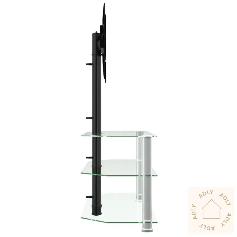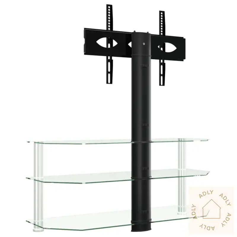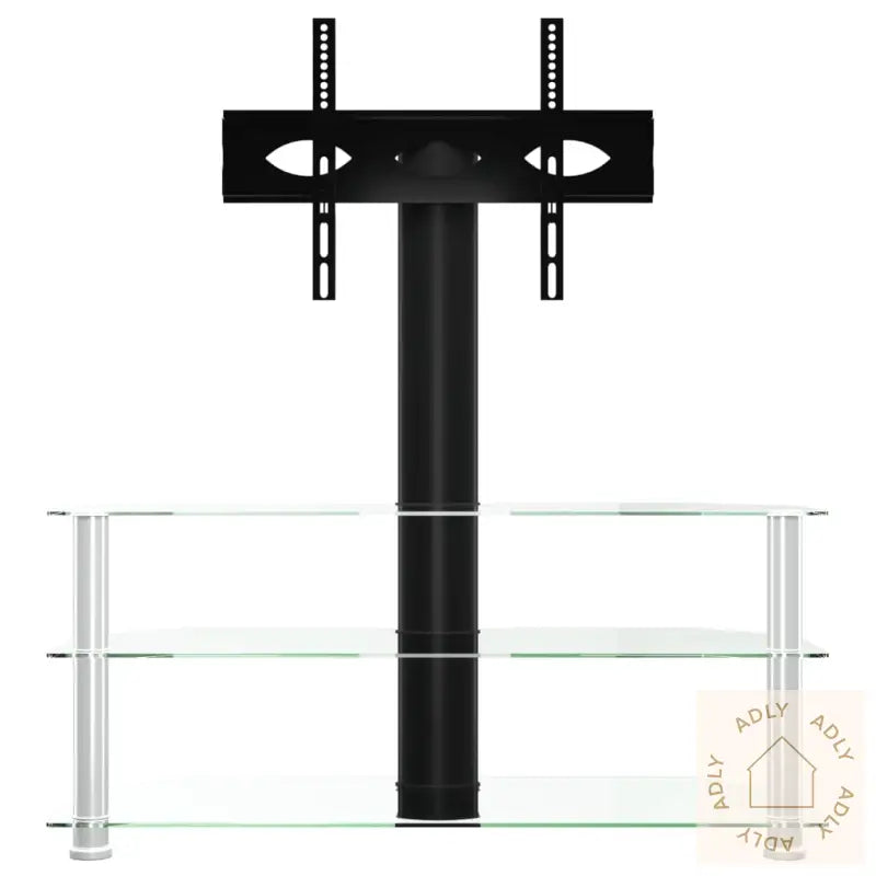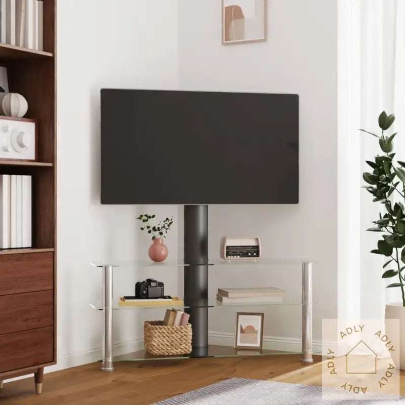 Svingfunksjon: TV-benken har en fleksibel brakett som kan dreies 25° til hver side, slik at du alltid finner en optimal visningsvinkel uansett hvordan rommet er innredet. Ideelt når flere ser på TV fra ulike deler av rommet.Rikelig med oppbevaringsplass: Medieskapet har tre solide hyller i glass, slik at du kan ha DVD-er, konsoller, bokser til multimediaenheter, bøker eller dekor liggende lett tilgjengelig, samtidig som alt ser ryddig ut. God bæreevne gir trygg plass til både tunge og lette gjenstander.Plassbesparende: Med sitt kompakte design er denne TV-benken ideell for små stuer, leiligheter og mindre kontorer. Den passer i hjørnet uten å ta opp mye gulvplass. Et integrert kabelhåndteringssystem sørger for orden bak TV-benken og lar deg skjule kabler og ledninger på en smart måte.VESA-kompatibilitet: TV-braketten støtter mange ulike VESA-mål, fra 100x100 mm til 600x400 mm, og passer dermed til de aller fleste moderne TV-er – fra 32 til 70 tommer. Det gjør det enkelt å bytte TV senere uten å måtte bytte hele møbelet.Godt å vite: