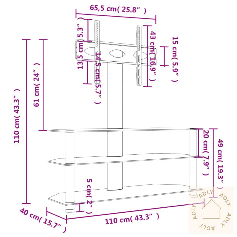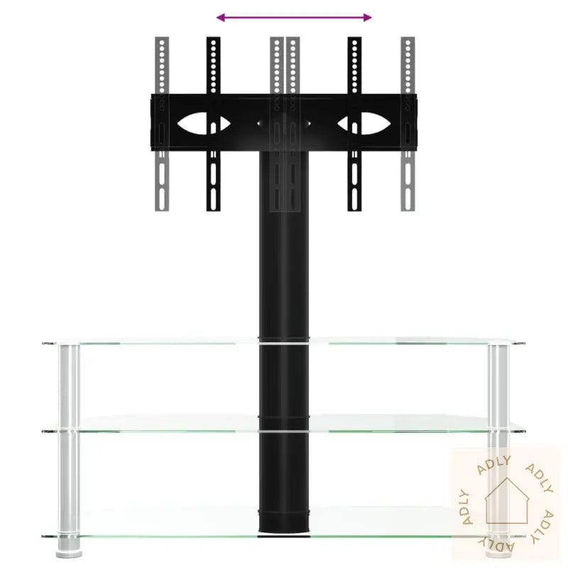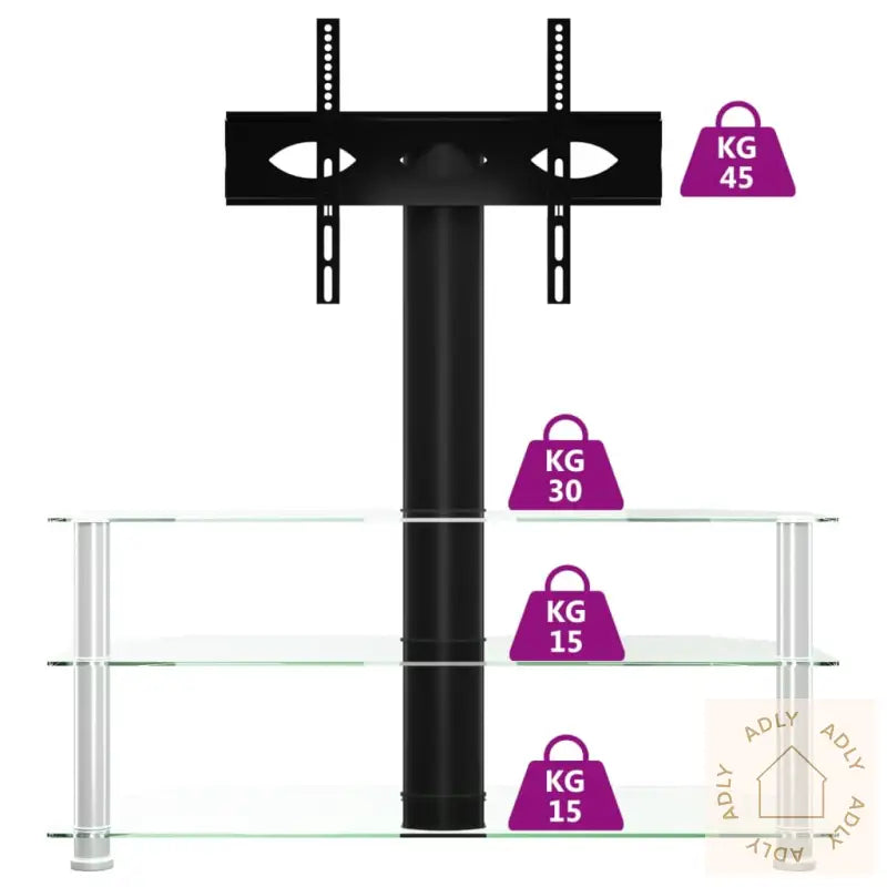 Farger: svart og sølv for et moderne uttrykk som passer til ulike møbler og stiler.Materialer: robust konstruksjon i aluminium, rustfritt stål, jern og glass for lang holdbarhet og enkel rengjøring.Mål: 110 x 40 x 110 cm (B x D x H)Mål bunn: 110 x 40 x 49 cm (B x D x H)Glasstykkelse fra topp til bunn: 6/5/5 mmHøyde fra TV-feste til glassbord: 61 cmMaks. bredde mellom to hull på braketten: 60 cmKompatibel VESA-størrelse: 100 x 100 mm til 600 x 400 mmPasser til TV-er fra 32 til 70 tommerBerkebrakett kan svinges opptil 25 grader til hver sideKabelhåndtering inkludert for et ryddig resultatMaks. lastekapasitet øverste glasshylle: 40 kgMaks. lastekapasitet for de to nederste glasshyllene: 15 kg hverMaks. lastekapasitet TV: 45 kgMontering kreves: ja, men enkel bruksanvisning følger med for rask oppsettingLegal Documents: