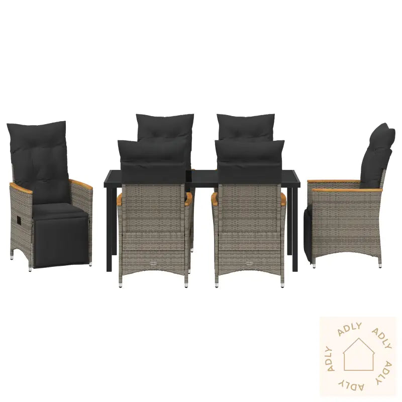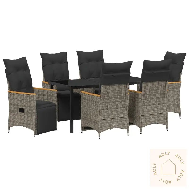 Antall elementer: 7 (6 stoler, 1 bord) – ideelt som utendørsmøbler for familien eller vennegjengen.Farge: Grå – passer lett inn med eksisterende dekor og andre hagemøbler.Form: Rektangulær – slitesterkt bord med rene linjer og enkel rengjøring.Materiale: Syntetisk PE-rotting – værbestandig, slitesterkt og lettstelt.Finish: Pulverlakkert – beskytter mot rust og gir en fin overflate.Innendørs/Ute: Kan brukes både inne og ute, alt etter behov.Trekk inkludert: Nei – du har mulighet til å velge egne trekk ved behov.Rom: Passer beste til hage og terrasse, men fungerer også på balkonger.Batterier inkludert: Nei – ingen elektroniske komponenter å tenke på.Hodegavl inkludert: Nei.Kapasitet: Maks vekt 110 kg per sete – trygg og solid løsning for voksne.Maksimalt antall personer: 6 – inviter venner eller hele familien!Maksimal vekt: 110 kg.Min-Max dimensjoner: 85/92 cm – tilpasser seg etter justering.Overflatehøyde: 1 cm.Ben høyde: 44 cm – komfortabel høyde for enkel adkomst.Sitte dybde: 50,5 cm – gir støtte til rygg og ben, ekte komfort.Sittekapasitet: 1 per stol.Vippearmer: Nei.Stige: Nei.Levering inneholder: 6 x Stol, 1 x Bord – komplett sett klart til montering.Montering kreves: Ja – enkel montering sammen med en venn.Anbefalt antall personer for montering: 2 – rask og grei oppsettprosess.