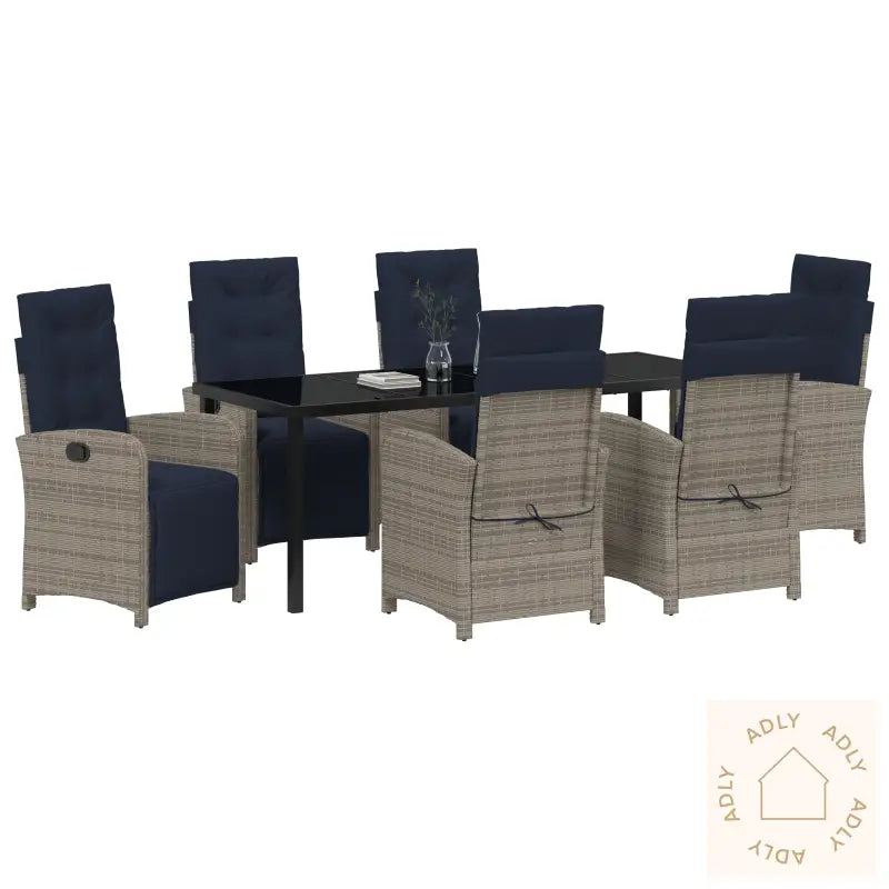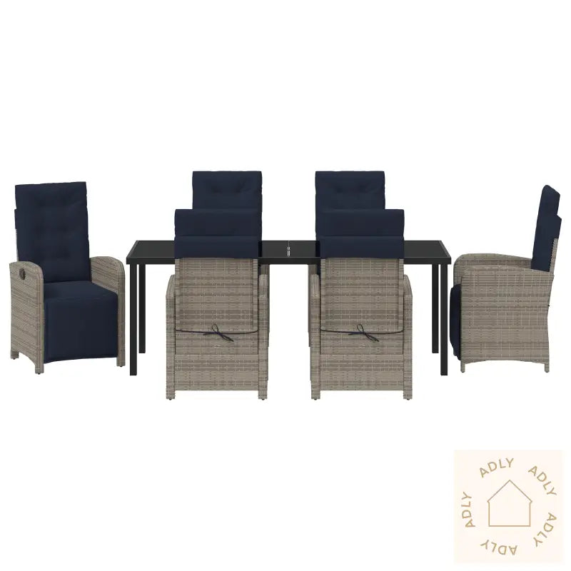 Dette settet med to recliner hage stoler med fotstøtter kombinerer moderne design med svært høy komfort – perfekt når du vil lene deg tilbake og slappe av utendørs. Den elegante grå poly rotting-veven sammen med marineblå puter gir et stilfullt og innbydende uttrykk, så disse hagemøblene passer flott på alt fra terrasse og balkong til hage.