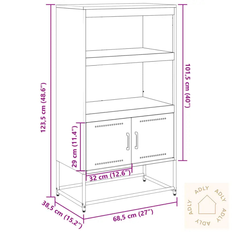Robust og stabil ramme: Skapet er laget av slitesterkt stål, noe som sikrer lang levetid og høy stabilitet. Dette materialet brukes ofte både i hagemøbler og andre møbler til hjemmet, nettopp fordi det tåler daglig bruk og holder seg pent over tid.Rikelig med oppbevaringsplass: Highboardet har 2 hyller og 2 rom, slik at du enkelt får lagret og organisert alt fra bøker til mindre ting til hjemmet. Du får god plass til å holde orden og ha tingene dine lett tilgjengelig.Enkel å rengjøre: Med stål som materiale er skapet veldig enkelt å holde rent. En fuktig klut er alt som trengs for å fjerne støv og smuss, så dette møbelet krever minimalt vedlikehold.Praktisk dør: De solide dørene skjuler tingene dine og gir et ryddig og organisert uttrykk, noe som gjør det enklere å holde rommet pent og oversiktlig.Advarsel: