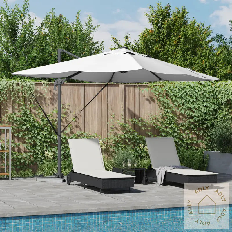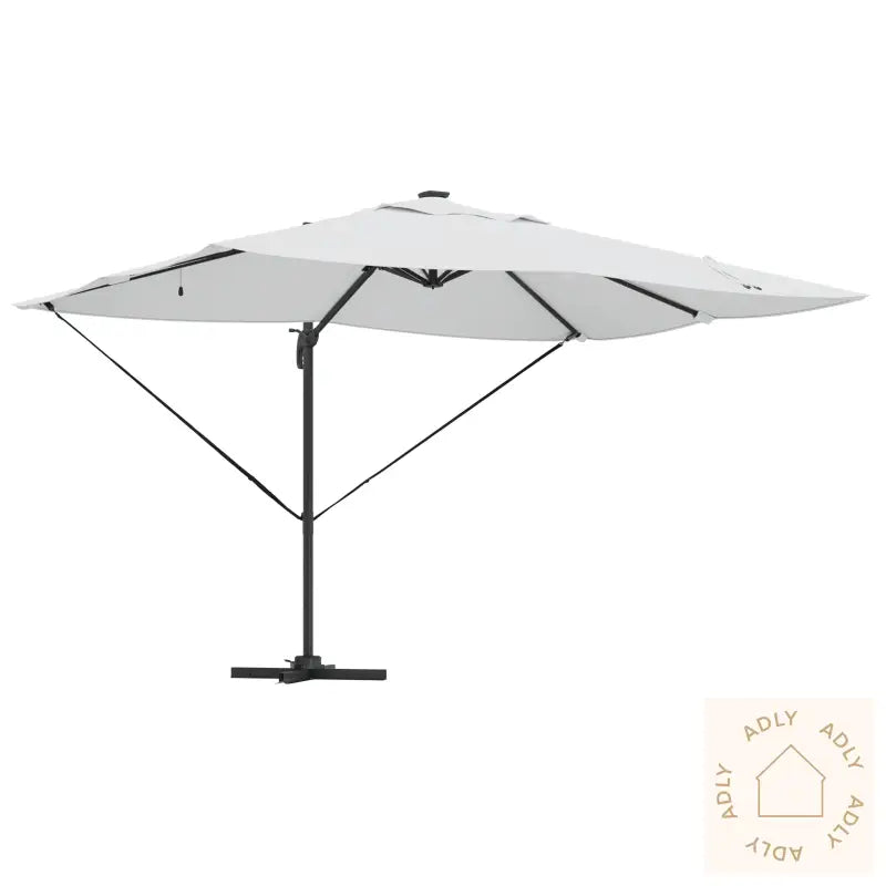 Denne cantilever Roma-parasolen gir deg en unik kombinasjon av moderne stil og praktisk funksjon til uterommet ditt. Perfekt for å skape en komfortabel sone med skygge på både terrasse, balkong og i hagen – ideell i kombinasjon med andre hagemøbler eller som et friskt supplement til møbler til hjemmet. Det flotte LED-lyset langs hver ribbe gir et sofistikert uttrykk og sørger for behagelig belysning som setter stemningen enten du har selskap eller bare vil nyte en rolig kveld utendørs.