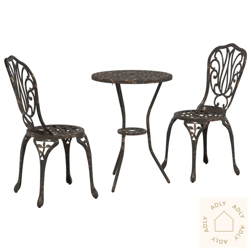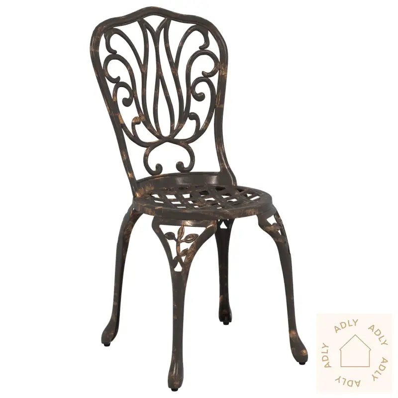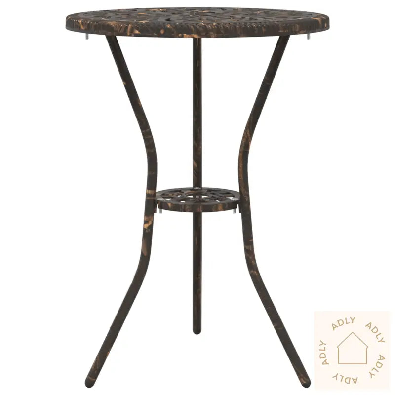 Dette runde utendørs spisebordsettet gjør det enkelt å skape en moderne og koselig spiseplass på balkongen eller i hagen. Perfekt for intime måltider og avslappende sommernetter, gir dette hagemøblet et lunt preg til små uteområder. Settet består av ett bord og to stoler i solid støpejern med lekker bronsefarge og dekorativt scrollmønster. Den elegante, matte finishen gir et klassisk uttrykk og gjør produktet til et tidløst valg blant utendørsmøbler.