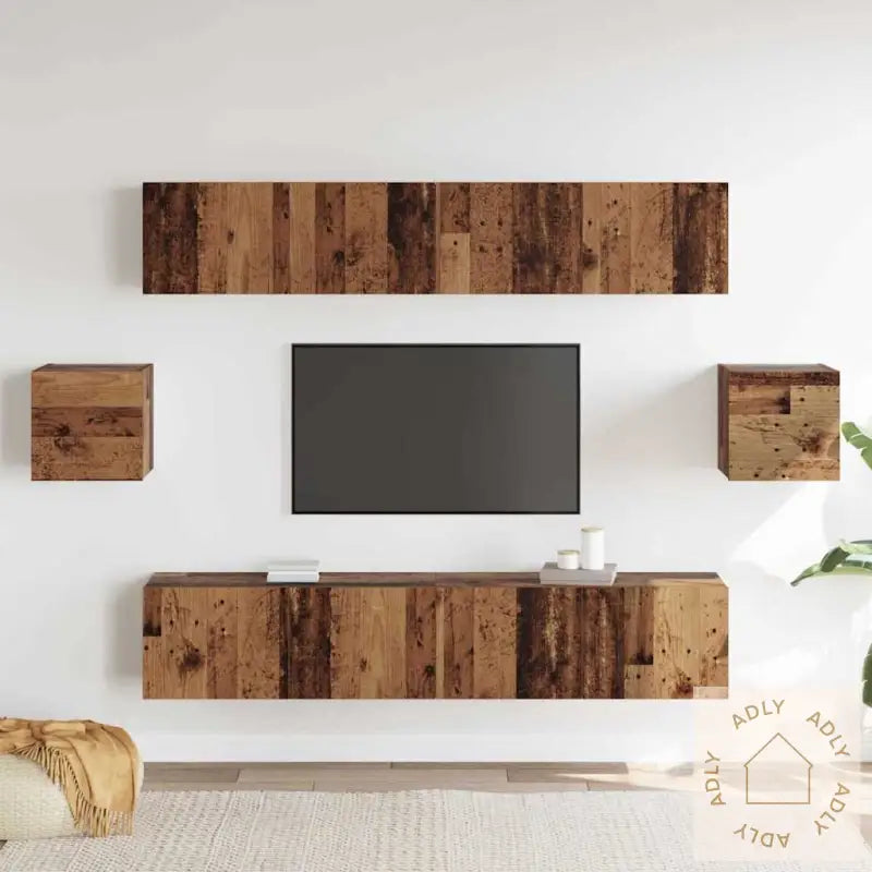 Dette vegghengte TV-skapsettet gir deg god lagringsplass med sine seks deler, laget av solid gjenvunnet tre for både holdbarhet og sjarm. Den slitesterke overflaten har en flott tekstur som gir ekstra karakter til rommet. Takket være sitt modulære design kan du enkelt tilpasse oppsettet etter dine behov – enten det er for bokhyller og stående hyller, mediautstyr eller annet interiør du ønsker å organisere.