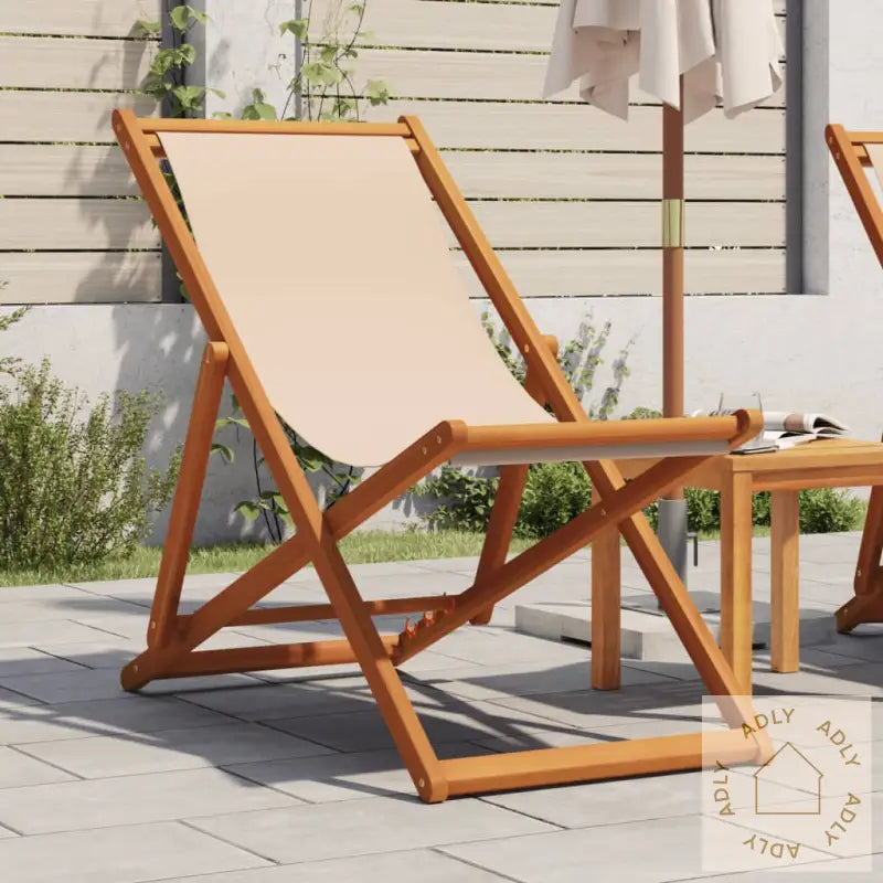 Farge: beigeMaterialer: heltre eukalyptus med oljefinish, stoff (100% polyester)Mål: 62 x (98/103/112) x (62/76/87) cm (B x D x H)Bredde sete: 45 cmVekt stoff: 230 g/m²Kan tilbakelenes i 3 posisjonerSammenleggbar for enkel transport og oppbevaringMaksimal lastekapasitet: 110 kgMontering kreves: ja