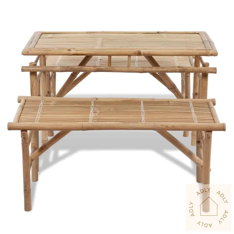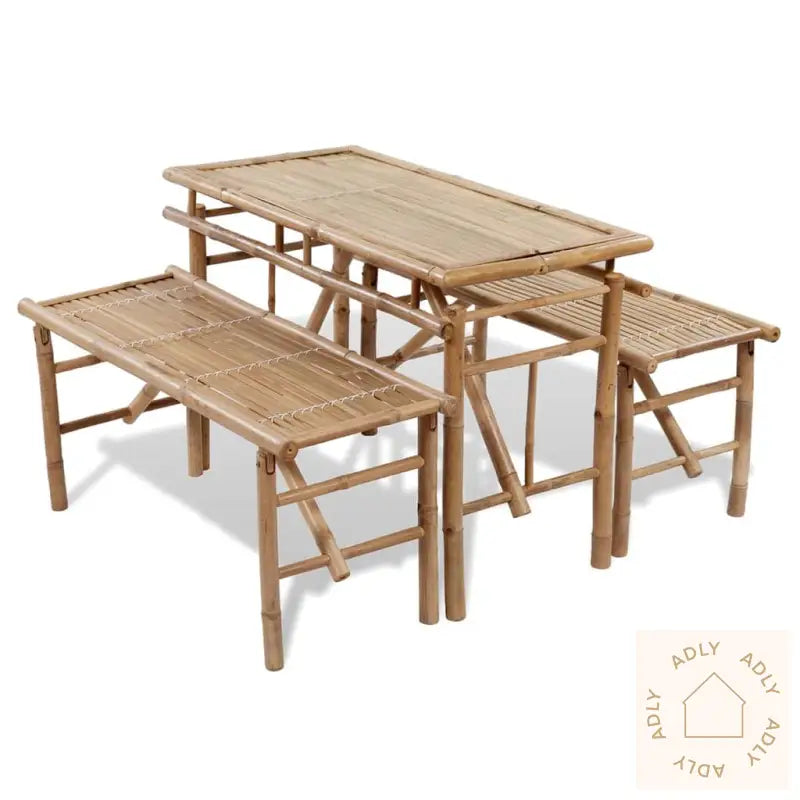 Dette høykvalitets hagesettet av bambus består av 1 bord og 2 matchende benker, og gir uterommet ditt en avslappet, tropisk stemning som passer perfekt i både hage og på terrasse. Hagesettet er ikke bare stilfullt, men også praktisk – både bord og benker kan enkelt slås sammen når de ikke er i bruk, noe som gjør dem lette å bære med seg eller oppbevare for å spare plass.