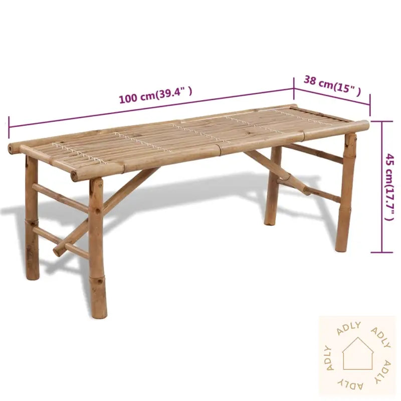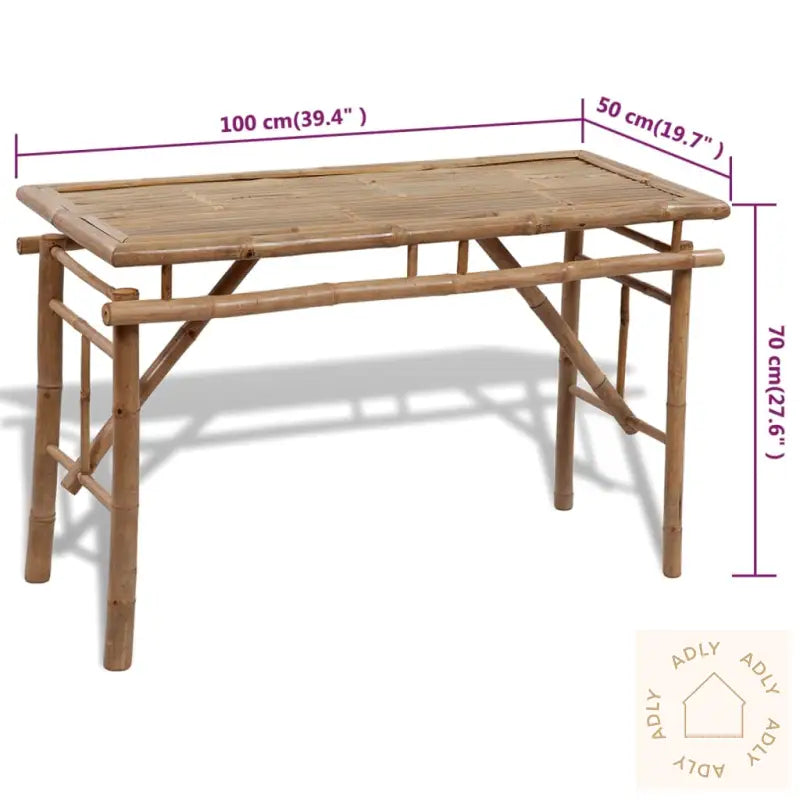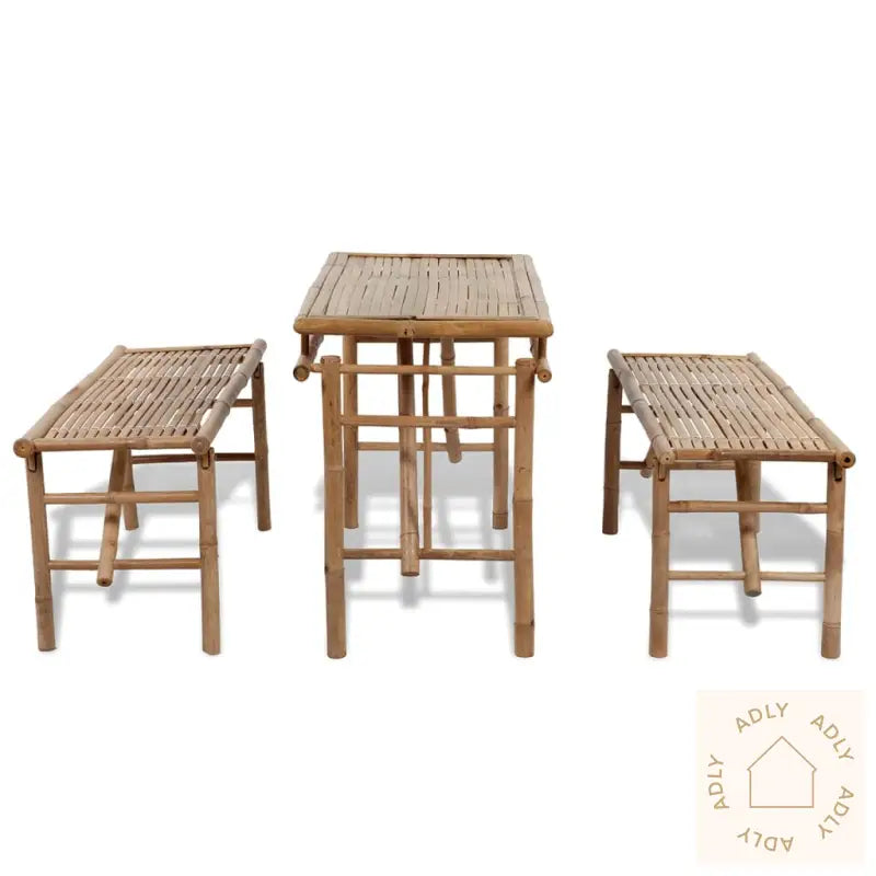 Materiale: bambusMål bord: 100 x 50 x 70 cm (L x B x H)Mål benk: 100 x 38 x 45 cm (L x B x H)Leveransen inkluderer 1 bord og 2 benker