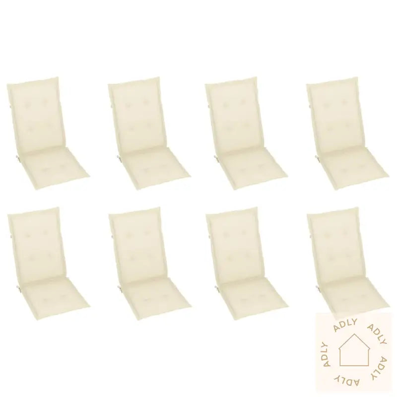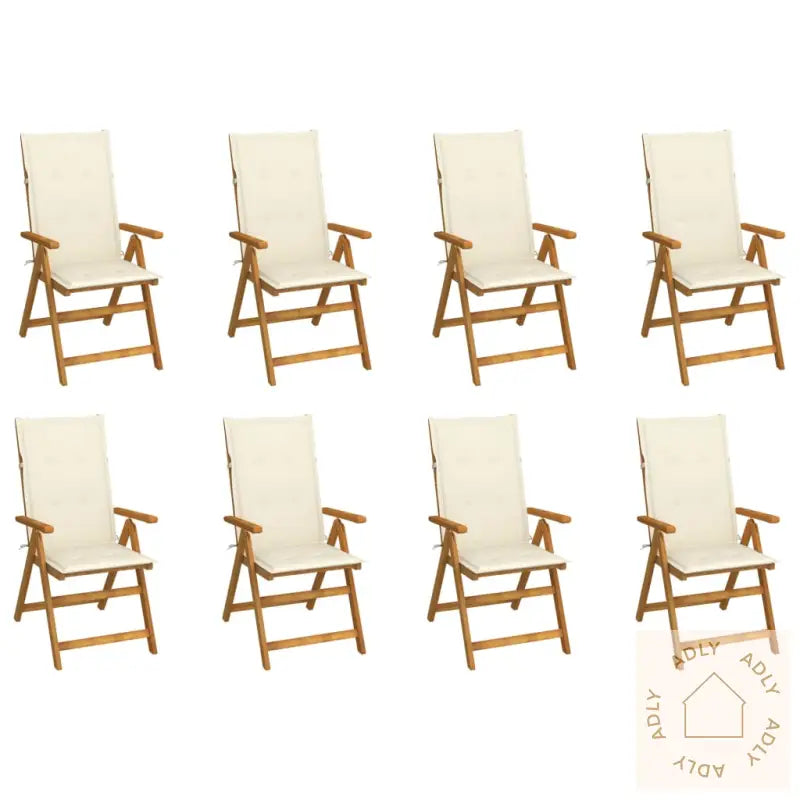 Farge pute: kremhvitMaterialer benk: heltre akasie med oljefinishMateriale pute: stoff (100% polyester)Mål stol: 57 x 69 x 111 cm (B x D x H)Mål pute: 120 x 50 x 3 cm (L x B x T)Sammenleggbar for enkel oppbevaring og transportPuten har 1 elastisk stropp og 2 sett med tauMontering kreves: jaLeveransen inneholder:8 x hagestoler8 x puter