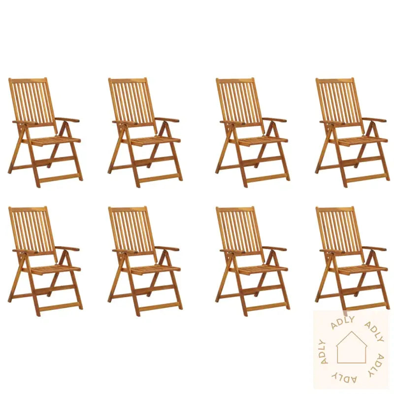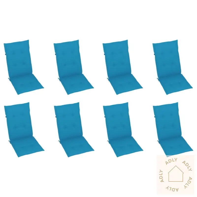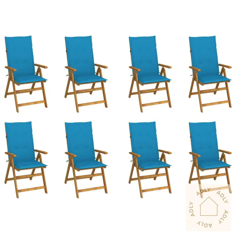 Farge pute: blåMaterialer benk: heltre akasie med oljefinishMateriale pute: stoff (100% polyester)Mål stol: 57 x 69 x 111 cm (B x D x H)Mål pute: 120 x 50 x 3 cm (L x B x T)Sammenleggbar for enkel oppbevaring og transportPuten har 1 elastisk stropp og 2 sett med tauMontering kreves: jaLeveransen inneholder:8 x hagestoler8 x puter