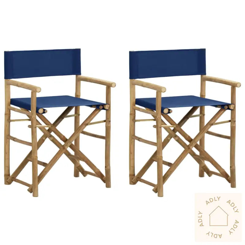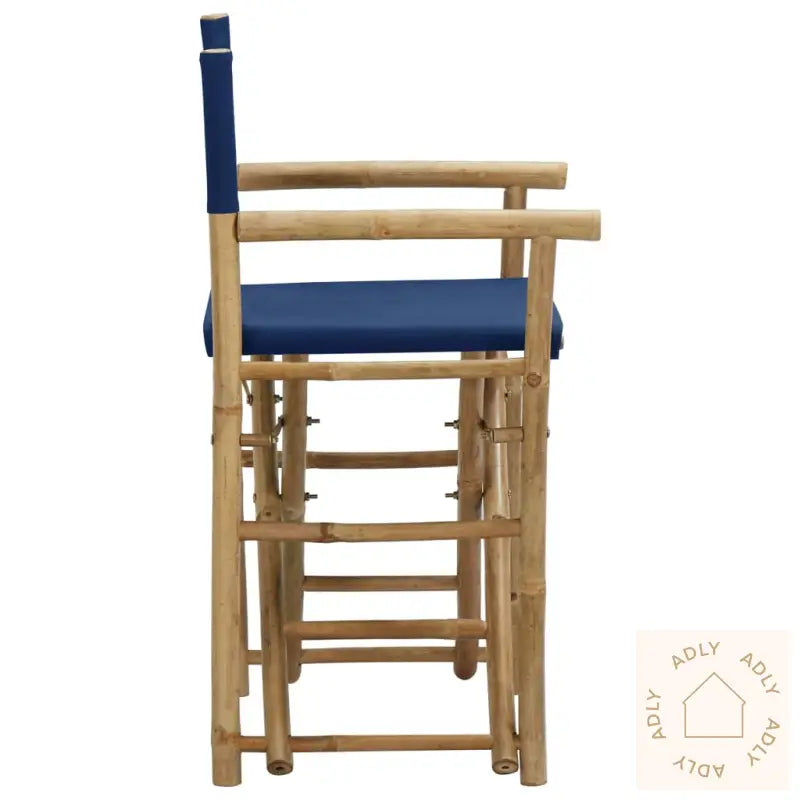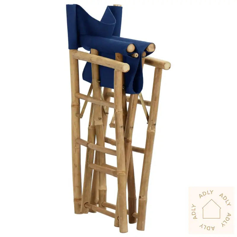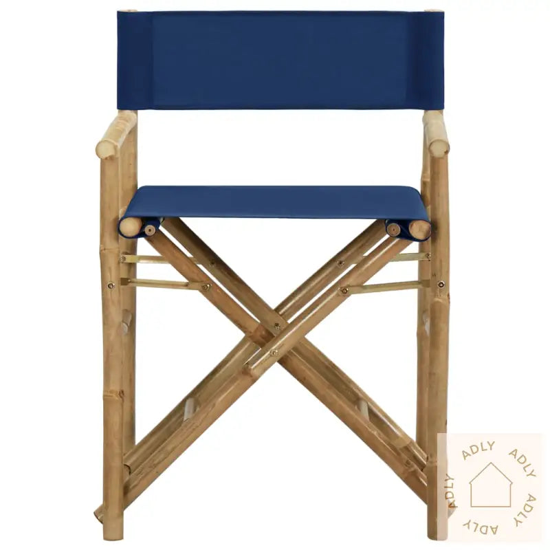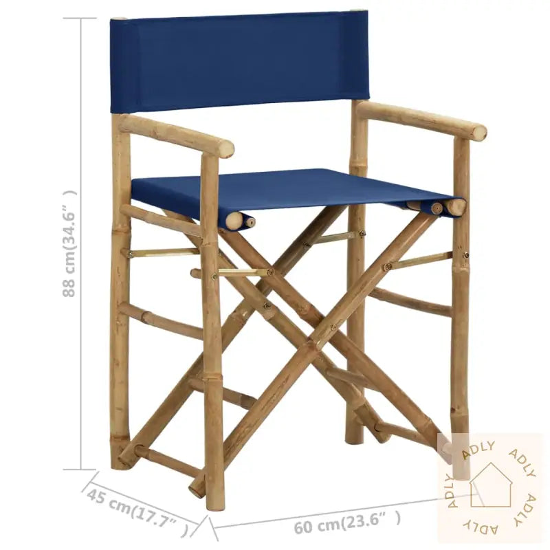Farge stoff: blåMaterialer: bambus, stoff (100% polyester)Samlet mål: 60 x 45 x 88 cm (B x D x H)Setehøyde fra bakken: 52 cmHøyde armlene fra bakken: 70 cmSammenleggbar for enkel oppbevaring og transportLeveransen inneholder:2 x regissørstoler