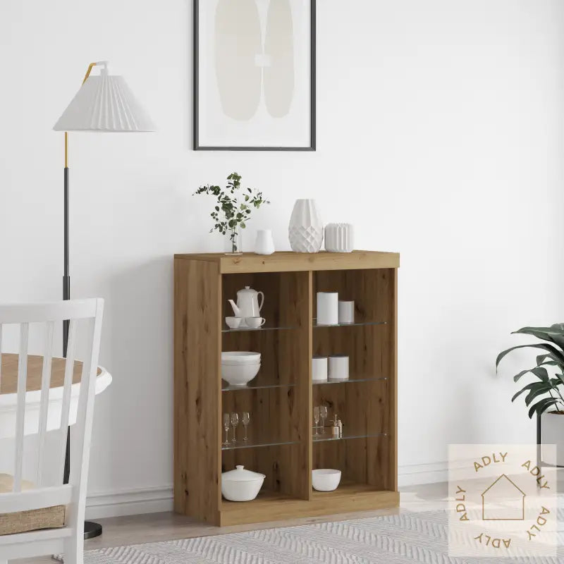 Møt vidaXL Sideboard med LED lys, elegant designet i Artisan Eik for et moderne og stilig preg på hjemmet ditt. Dette sideboardet kombinerer både funksjonalitet og estetikk, og gir deg muligheten til å vise frem favorittlekene eller pyntegjenstandene dine på en vakker måte, samtidig som du holder rommet ryddig og organisert.