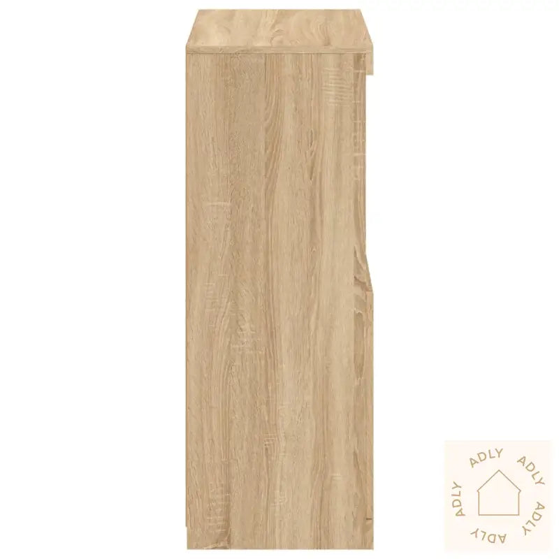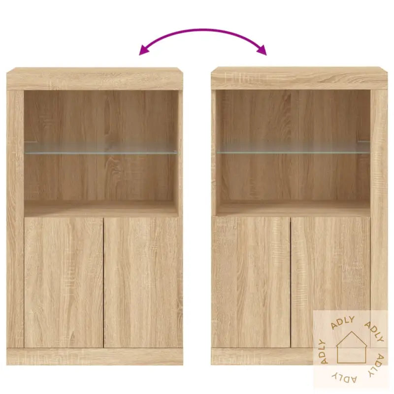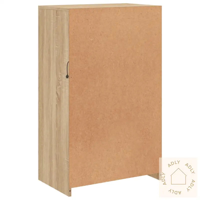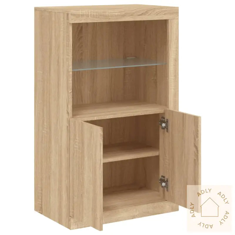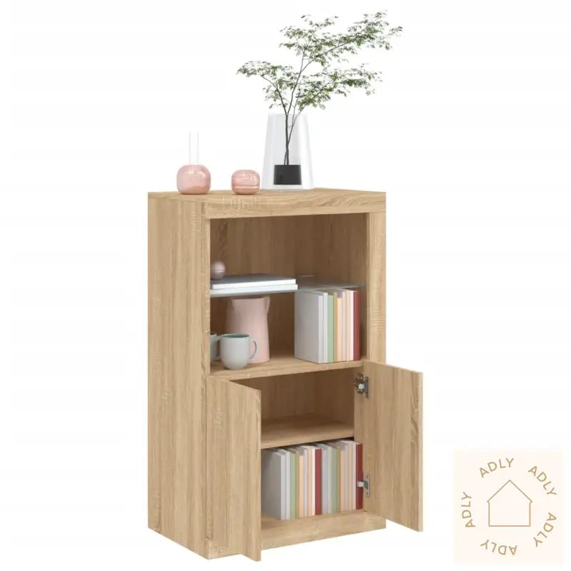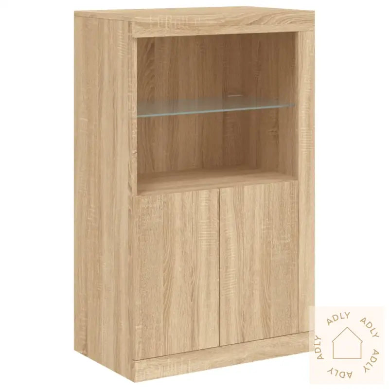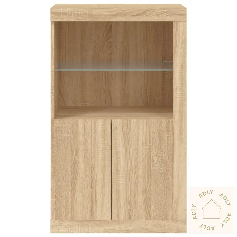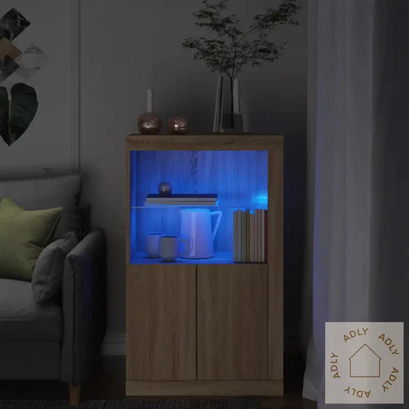 Slitesterkt materiale: Skapet er laget av konstruert tre i høy kvalitet, kjent for sin styrke og stabile konstruksjon. Den glatte overflaten er enkel å holde ren, mens materialet tilbyr god motstand mot fuktighet, slik at møbelet holder seg pent over tid.RGB LED-lys: Med innebygde RGB LED-lys får du spennende muligheter til å forandre stemningen i rommet. Du kan tilpasse både fargen og lysinnstillingene via ulike menyer, eller la lyset veksle automatisk mellom fargene. Dette gir skapet et unikt og trendy uttrykk, og passer perfekt hvis du vil ha en moderne touch til innredningen din. LED lysene gir også en ekstra wow-faktor når skapet brukes på kveld eller i dempet belysning.Rikelig med oppbevaringsplass: Sideskapet i sonoma eik har en robust glasshylle og et skjult oppbevaringsrom bak dørene, som gjør det enkelt å holde både pynt og nødvendigheter organisert og lett tilgjengelig. Perfekt for å holde orden, enten det står i gangen, stuen eller soverommet.Praktisk dør: De solide dørene hjelper deg å beskytte innholdet mot støv, og lar deg enkelt skjule alt som ikke skal stå fremme. Det gir et ryddigere og mer eksklusivt uttrykk i hjemmet ditt.Godt å vite: