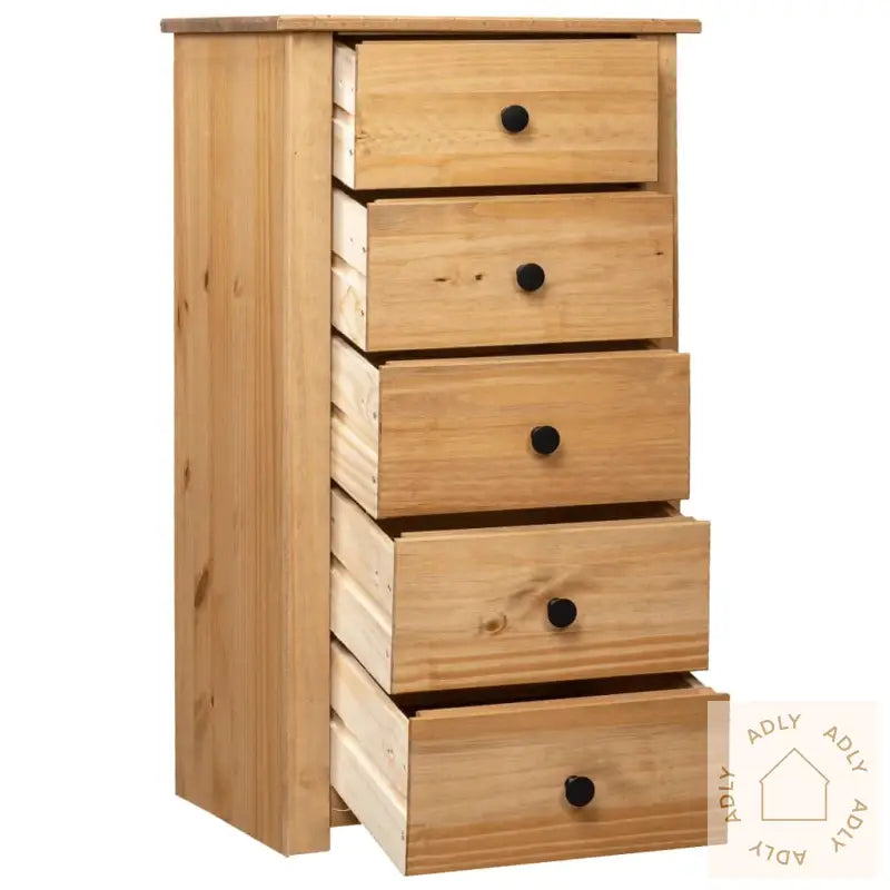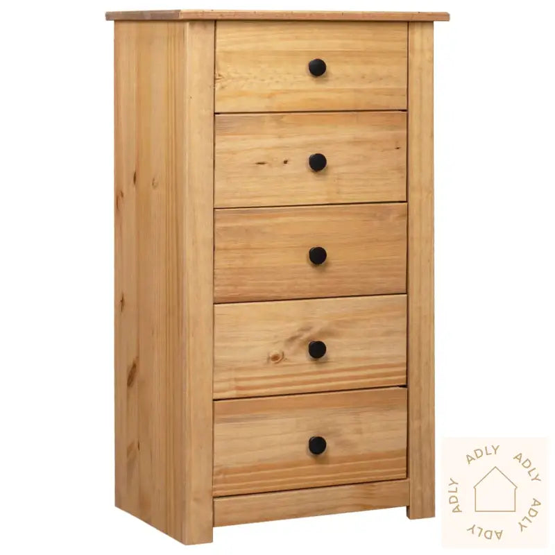 Den robuste kommoden i Panama-serien er laget av heltre furu, noe som sikrer lang holdbarhet og stabilitet. De fem romslige skuffene gir deg god plass til å organisere alt fra småting og fjernkontroller til kontorartikler og klær. Den solide toppflaten er ideell til å sette ut pyntegjenstander, bilder eller grønne planter, og tilfører personlighet til rommet. Overflaten på skjenken tørkes enkelt av med en tørr klut, slik at du raskt kan holde den pen. Produktet leveres med enkel monteringsanvisning, så du kan ta i bruk det nye favorittmøbelet ditt på kort tid.