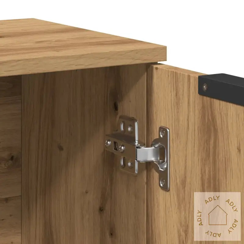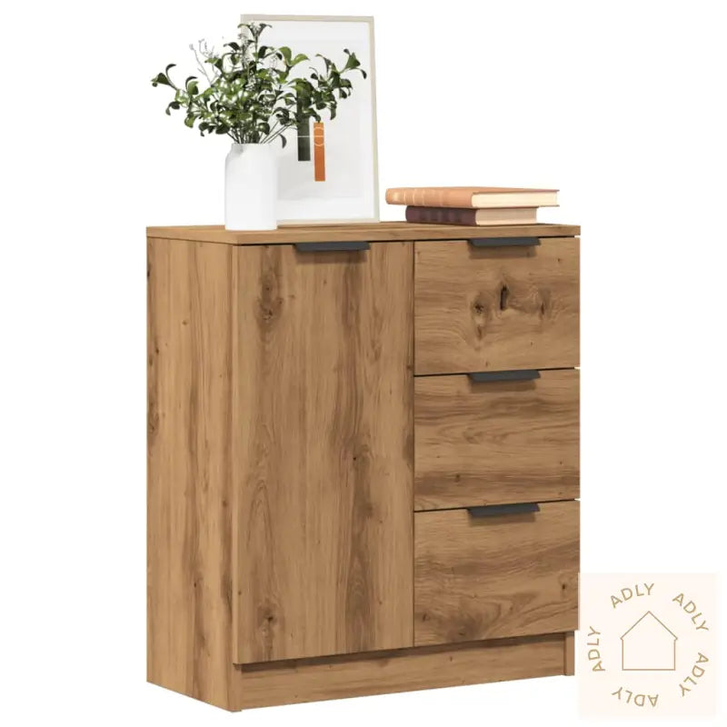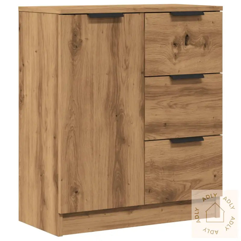 Stabilt og slitesterkt materiale: Skjenken er laget av konstruert tre, som er kjent for å være både robust og holdbart. Overflaten er jevn og motstandsdyktig mot både fukt, vridning og sprekker. Dette gjør den ideell for daglig bruk, samtidig som den holder seg fin over tid. Perfekt om du ønsker stabile møbler til hjemmet eller hagemøbler med lang levetid innendørs.Rikelig med oppbevaringsplass: Med sine tre skuffer og to rom har bufféen god plass til alt du trenger for å holde orden. Her kan du enkelt samle servise, bøker, dekor eller andre nødvendigheter så alt er lett tilgjengelig og ser ryddig ut.Utstillingsplass på toppen: Den solide toppen i artisan eik er perfekt til å stille ut dekorative gjenstander, favorittbilder eller grønne planter, slik at du virkelig kan fremheve din personlige stil og skape en hyggelig atmosfære hjemme.Enkelt vedlikehold: Overflaten er designet for å være lett å rengjøre – det holder med en fuktig klut for å holde skjenken pen og velstelt, uten mye ekstra arbeid. En praktisk fordel for travle hverdager!Advarsel: