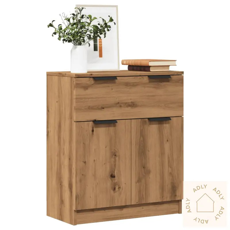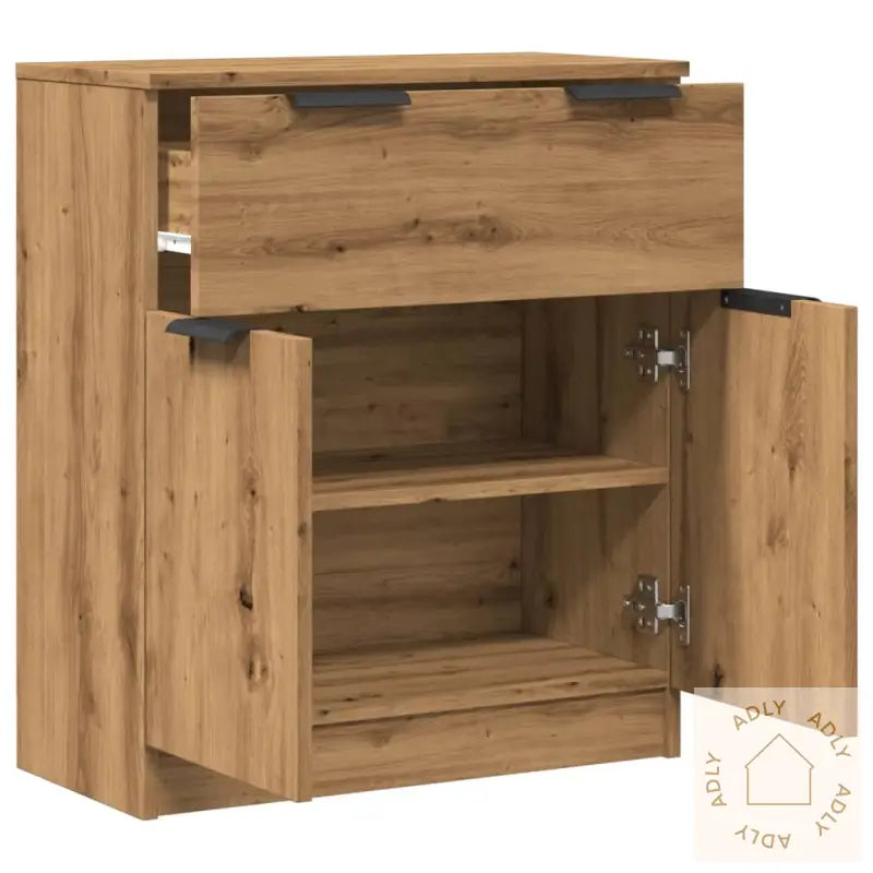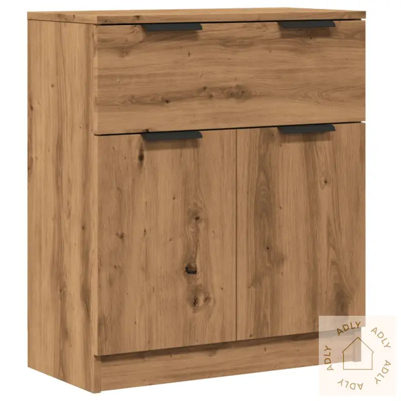 Stabilt og slitesterkt materiale: Den er laget av konstruert tre, som er kjent for sin styrke og lang levetid. Materialet har en glatt overflate som er motstandsdyktig mot fuktighet, så du slipper bekymringer for vridning eller sprekker. Ideelt for deg som vil ha solide møbler til hjemmet uten mye vedlikehold.God plass til oppbevaring: Skjenken gir deg massevis av oppbevaringsmuligheter takket være to romslige skuffer og to åpne rom. Perfekt for å holde orden på alt fra servise og bestikk til bøker, småting eller dekorative elementer – alt er lett tilgjengelig og ryddig organisert.Utstillingsplass: Den robuste toppen i artisan eik egner seg supert til å stille ut favorittdekor, bilder eller grønne planter. Sånn kan du gjøre møbelet personlig og vise frem detaljene du liker mest, samtidig som du får et funksjonelt innslag i rommet.Enkel rengjøring: Med den glatte overflaten er denne oppbevaringshyllen enkel å tørke av med en fuktig klut – ingen stress med vedlikehold, bare bruk og glede året rundt.Advarsel: