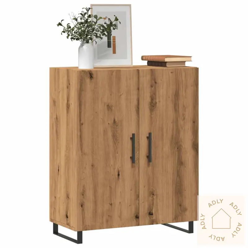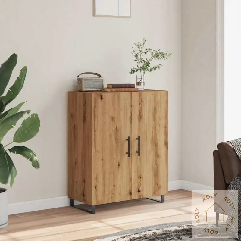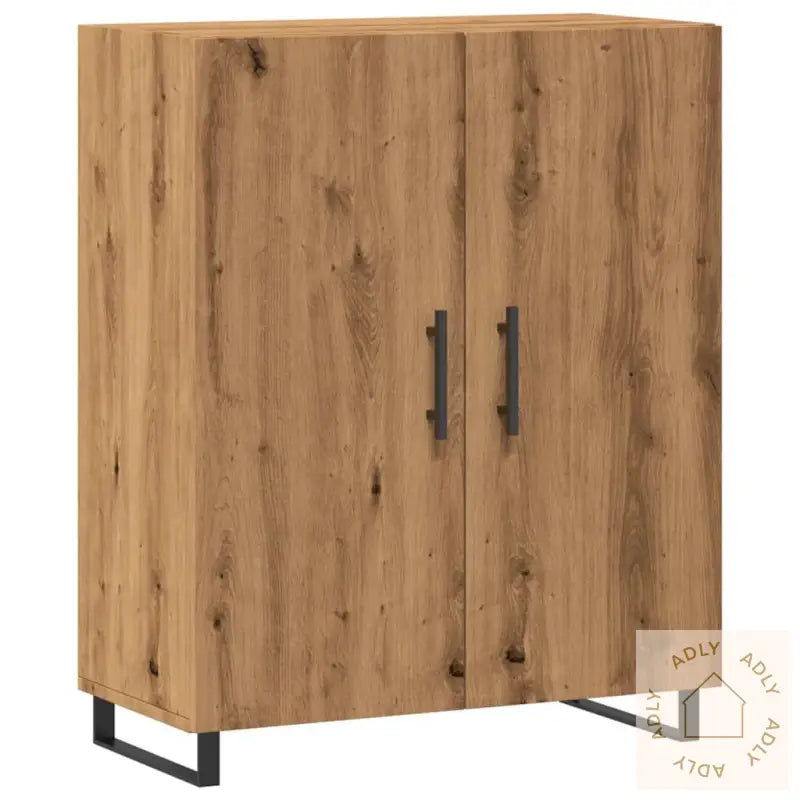 Slitesterkt materiale: Konstruert tre av høy kvalitet gir skapet en solid og stabil konstruksjon, som tåler daglig bruk. Overflaten er glatt, lett å holde ren med en fuktig klut, og konstruert tre har også god motstand mot fuktighet. Dette gjør skjenken praktisk over tid – den holder seg fin selv med mye bruk.Rikelig med lagringsplass: Skjenken gir deg god plass til å oppbevare hverdagslige ting som servise, bøker, eller tekstiler. Her får du organisert alt på en ryddig måte, og du holder enkelt orden i rommet.Visningsfunksjon: Topplaten på skapet har plass til å vise frem favorittdekor, små planter eller fotoalbum. Det gir deg mulighet til å sette ditt personlige preg og gjøre rommet enda hyggeligere.Praktiske håndtak: Stilrene håndtak i behagelig design gjør det enkelt å åpne og lukke dørene på skjenken. Håndtakene er ikke bare brukervennlige, men også et dekorativt element som gir ekstra stil til skapet.Metallføtter: De solide metallføttene gir skapet et moderne uttrykk samtidig som de sørger for god stabilitet og lang levetid. Metallføttene beskytter også gulvet mot riper, og gir et elegant løft til hele møbelet.Advarsel: