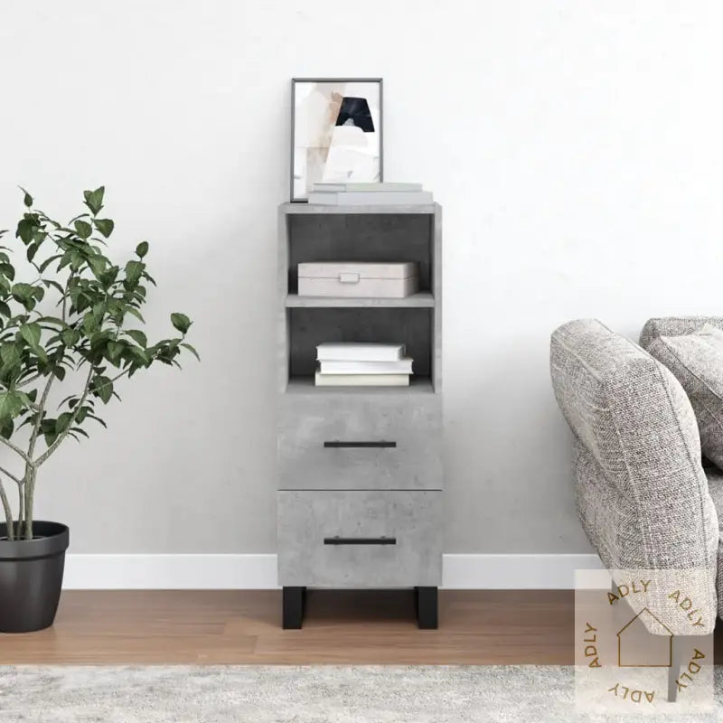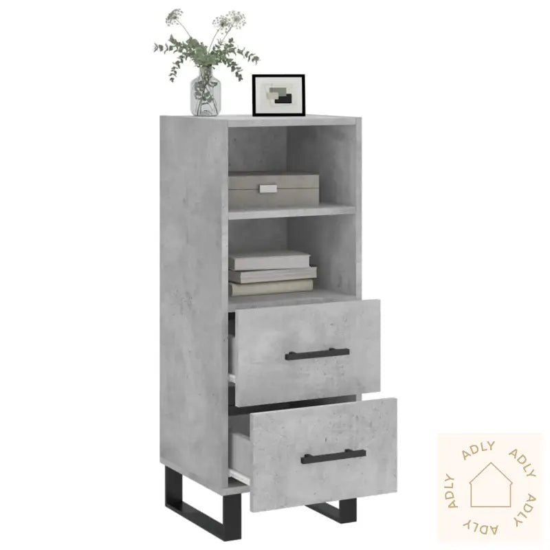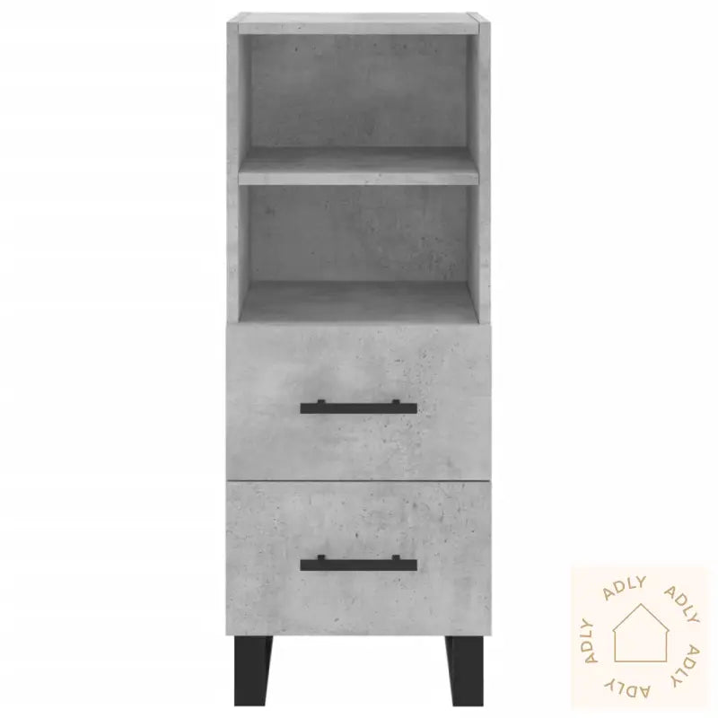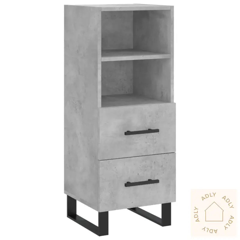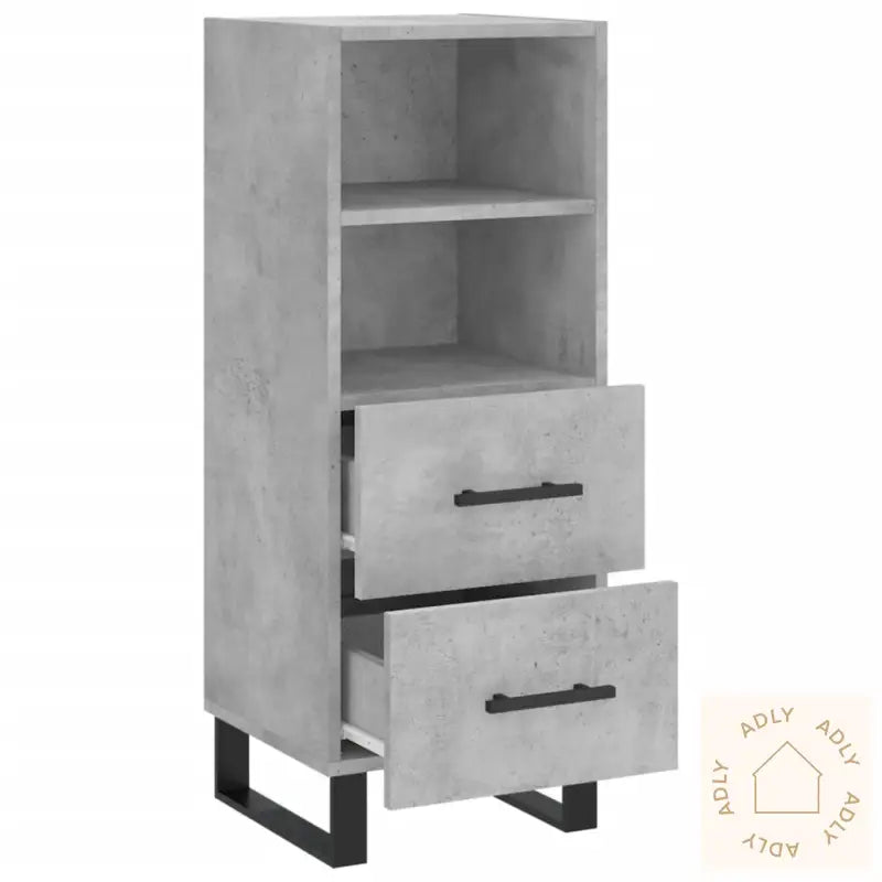 Slitesterkt materiale: Skjenken er laget av høykvalitets konstruert treverk, som ikke bare gir en glatt overflate og elegant utseende, men også sørger for styrke, soliditet og god motstand mot fukt. Dette betyr at møbelet varer lenge, selv ved daglig bruk.Metallben: De stilige metallbena gir skjenken et friskt og moderne preg, og er med på å løfte helhetsinntrykket på rommet. Samtidig sørger de for at skjenken står stabilt på gulvet, noe som er viktig for sikkerheten i hjemmet.Rikelig med oppbevaringsplass: Med to skuffer og to åpne rom får du mange muligheter til praktisk oppbevaring – perfekt for å holde orden på alt fra servise og glass til småting og dokumenter. Alt er lett tilgjengelig, men ryddig skjult.Stabil og robust topp: Den solide toppflaten gir god plass til dekor – enten du vil vise frem fine interiørelementer, personlige bilder eller grønne planter, tåler denne overflaten det meste.Advarsel: