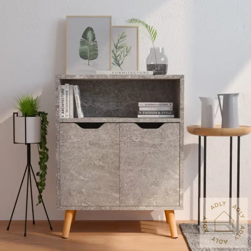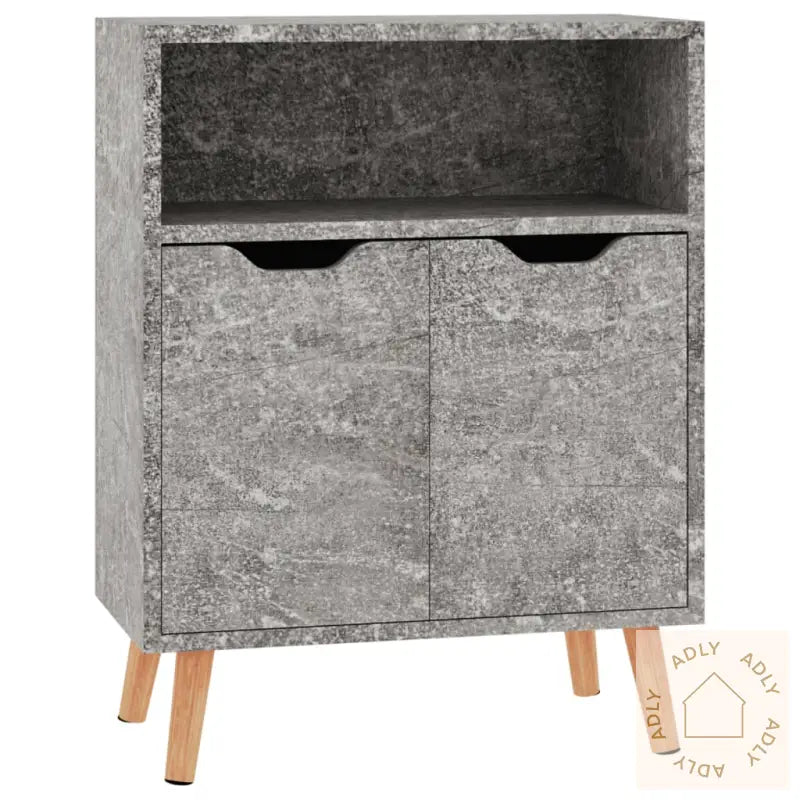 Denne skjenken gir et snev av eleganse og gir et stilig utseende til stuen, og passer godt inn sammen med andre møbler til hjemmet. Skapet er laget av kvalitets konstruert tre, noe som lover lang holdbarhet og gjør det enkelt å holde rent—bare tørk over med en fuktig klut ved behov. Den betonggrå finishen gir et moderne og tidløst uttrykk som matcher både klassiske og mer moderne møbler og stående hyller.