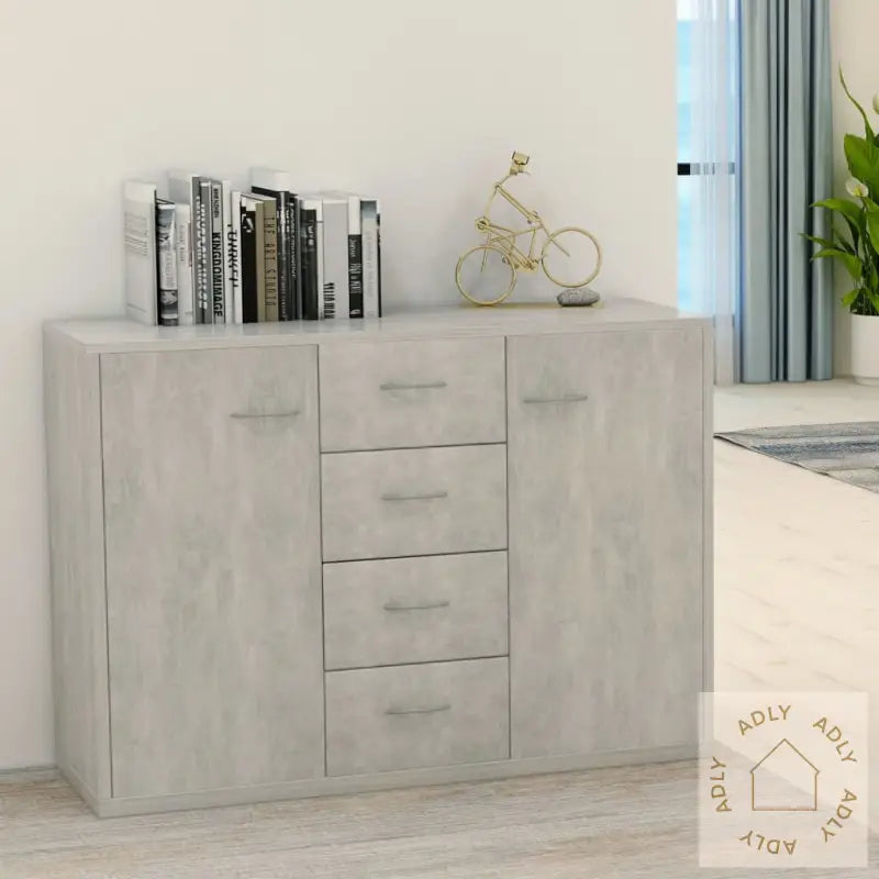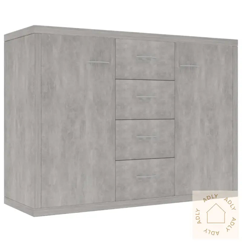 Farge: betonggråMateriale: konstruert treSamlet mål: 88 x 30 x 65 cm (B x D x H)Med 4 skuffer og 2 dørerVennligst merk: Skrue(r) og plugg(er) for innsiden av veggen er ikke inkludert. Bruk skruer og plugger som passer til din veggtype. Er du usikker, anbefaler vi å søke profesjonell hjelp. Følg monteringsinstruksjonen nøye for best resultat.