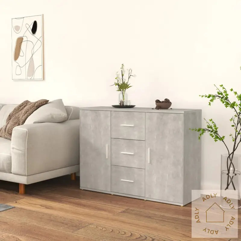 Slitesterkt materiale: Skapet er laget av konstruert tre av høy kvalitet. Dette gir en glatt overflate samtidig som det sørger for god styrke, stabilitet og fuktmotstand – noe som gir deg solide møbler du kan ha glede av i mange år.Rikelig lagringsplass: Her får du både 2 dører og 3 skuffer, slik at du lett kan organisere og skjule alt fra bøker til multimedieapparater, spill eller andre gjenstander du vil ha innen rekkevidde, men uten rot.Praktisk topplate: Den robuste toppen gir deg ekstra plass til å vise fram favorittdekor, fotorammer eller grønne planter. Bruk skjenken som et midtpunkt i rommet, eller la den komplettere andre møbler.Merk: