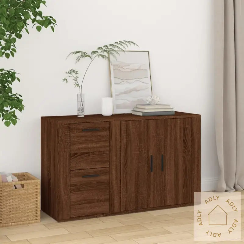 Solid materiale: Skapet er laget av konstruert tre, som gir god styrke, stabilitet og lang levetid. Materialet har en jevn og elegant overflate som er enkel å holde ren med en fuktig klut. I tillegg tåler det daglig bruk og har høy motstand mot fuktighet – noe som gjør skjenken til et robust valg blant både innendørs- og utendørsmøbler.Rikelig med lagringsplass: Med flere hyller og skapdører får du rikelig med plass til å organisere alt du trenger i hverdagen – enten det er servise, duker eller småting du vil ha lett tilgjengelig.Stilfull visningsflate: Toppen av skjenken er stor nok til å fremheve dine favorittdekorasjoner, familiebilder, planter eller suvenirer. Det gir deg muligheten til å sette et personlig preg på rommet.Montering er enkel – det følger med tydelig monteringsveiledning i esken, så du raskt får møbelet klart til bruk.