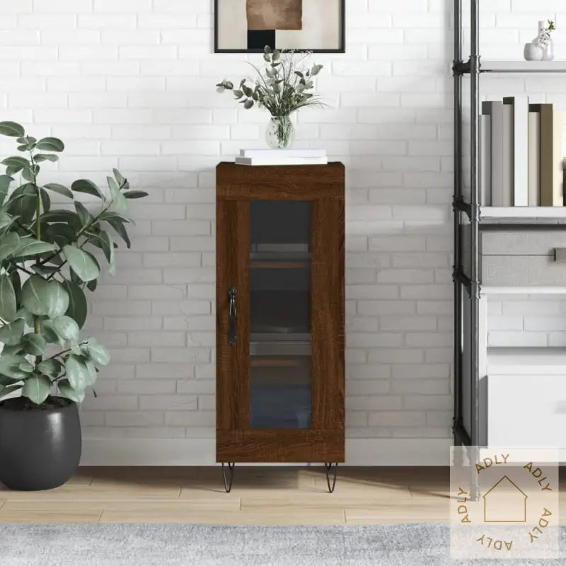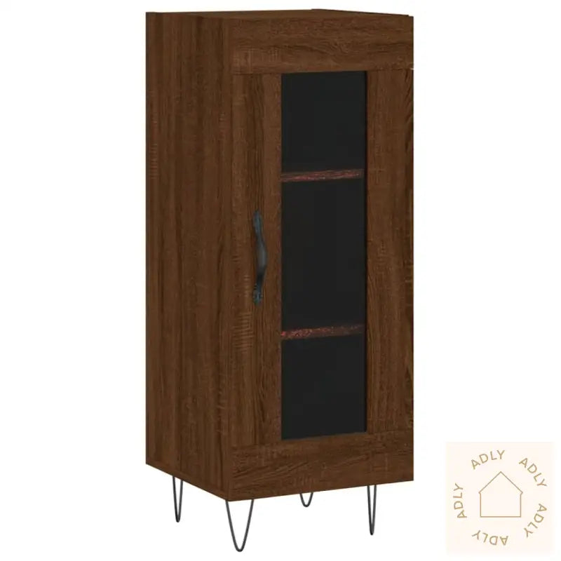 Slitesterkt materiale: Skjenken er laget av konstruert tre med brun eik-finish – et kjent og solid materiale for møbler, som både ser flott ut og gir god holdbarhet. Det glatte treverket står imot fuktighet, tåler daglig bruk, og holder seg pent år etter år.Rikelig med lagringsplass: Med en smart innredning får du god plass til å oppbevare alt fra servise til bøker eller andre ting du vil ha lett tilgjengelig. Dette gir deg muligheten til å holde hjemmet organisert og ryddig.Visningsfunksjon: Toppen av skjenken fungerer perfekt som utstillingsplass for dekorasjoner, bilder eller blomster, slik at du kan sette et personlig preg på rommet og vise frem det du er glad i.Praktisk design: Skapdøren i glass gir deg enkel oversikt over hva du oppbevarer, og hjelper deg å finne det du trenger raskt. Moderne, brukervennlige løsninger oser av kvalitet, og det stilrene uttrykket i brun eik matcher perfekt med andre møbler til hjemmet.Advarsel: