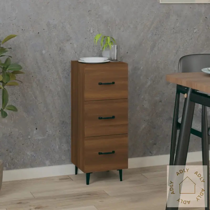 Solid materiale: Skapet er laget av førsteklasses konstruert treverk som både ser lekkert ut og er svært slitesterkt. Overflaten er glatt og enkel å vedlikeholde, og materialet tåler både daglig bruk og fuktighet – en stor fordel for aktive hjem.Rikelig med oppbevaringsplass: Med flere skuffer får du god plass til å organisere alt fra bøker og dokumenter til småting du vil ha unna, men lett tilgjengelig. Dette sideskapet hjelper deg å holde stua ryddig og gir et oversiktlig uttrykk i rommet.Robust topp: Den solide toppen i brun eik gir deg også mulighet til å vise frem dekorative elementer, som favorittbildene dine, grønne planter eller pyntegjenstander, slik at du kan sette ditt personlige preg på møblene.Advarsel: