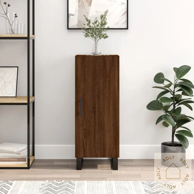 Skapet er laget av konstruert tre i brun eik, et materiale kjent for sin holdbarhet, styrke og fuktmotstand. Den glatte overflaten gjør det enkelt å holde møbelet pent og rent, så du kan nyte den elegante looken i lang tid.Robuste metallben gir skjenken et moderne og rolig uttrykk samtidig som de sørger for god stabilitet og støtte – en detalj som gir skapet både karakter og funksjonalitet.Du får mye plass til oppbevaring gjennom tre rom, slik at du enkelt kan holde orden på alt fra servise, bøker til mindre gjenstander – alt er lett tilgjengelig, men uten rot.Topplaten er solid og perfekt for å vise frem ting du setter pris på; pynt opp med dekorasjoner, favorittbilder eller en grønn potteplante for mer liv i rommet.Bak døren kan du enkelt skjule det du ikke vil ha fremme – både praktisk og ryddig. Dørens håndtak gir deg enkel tilgang til alt du har plassert inni, og beskytter det mot støv.Advarsel: