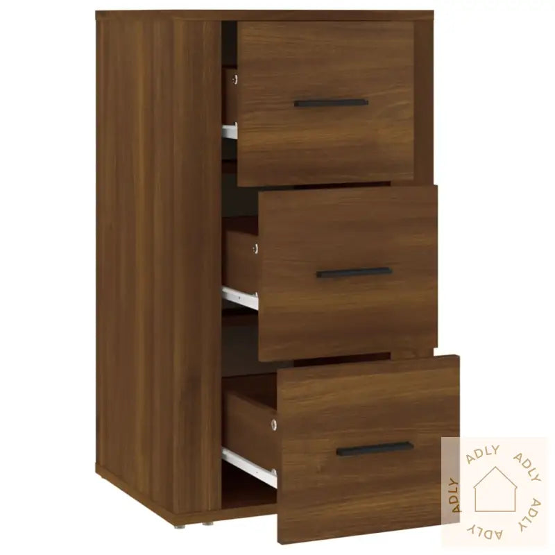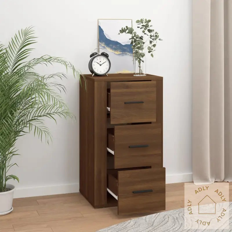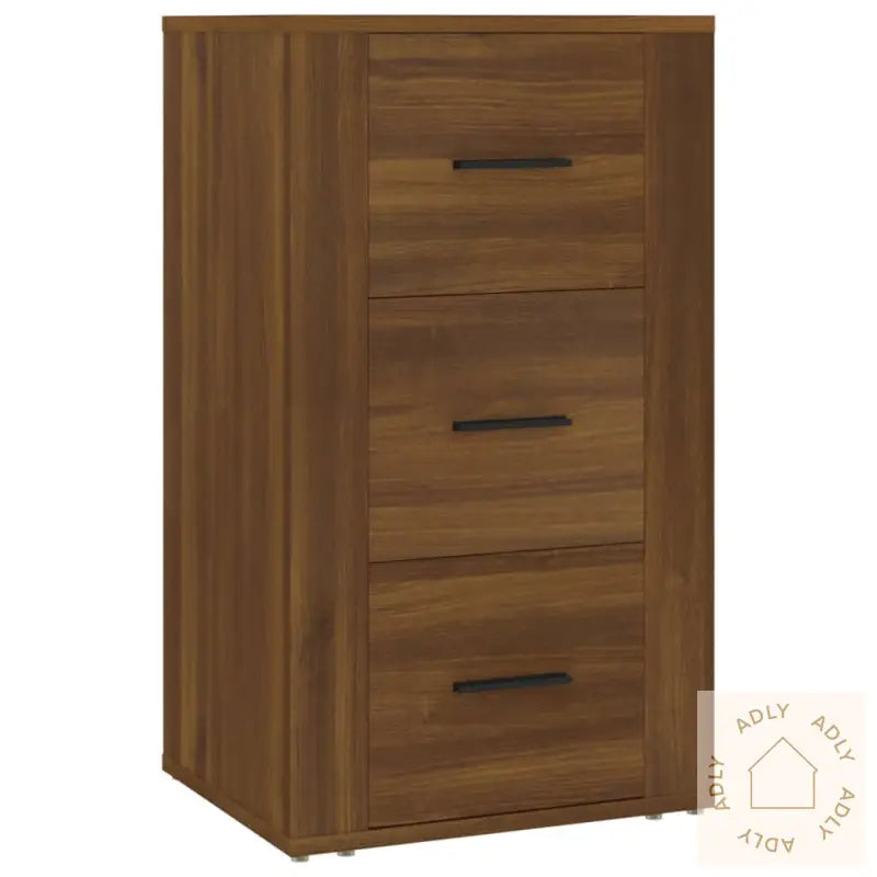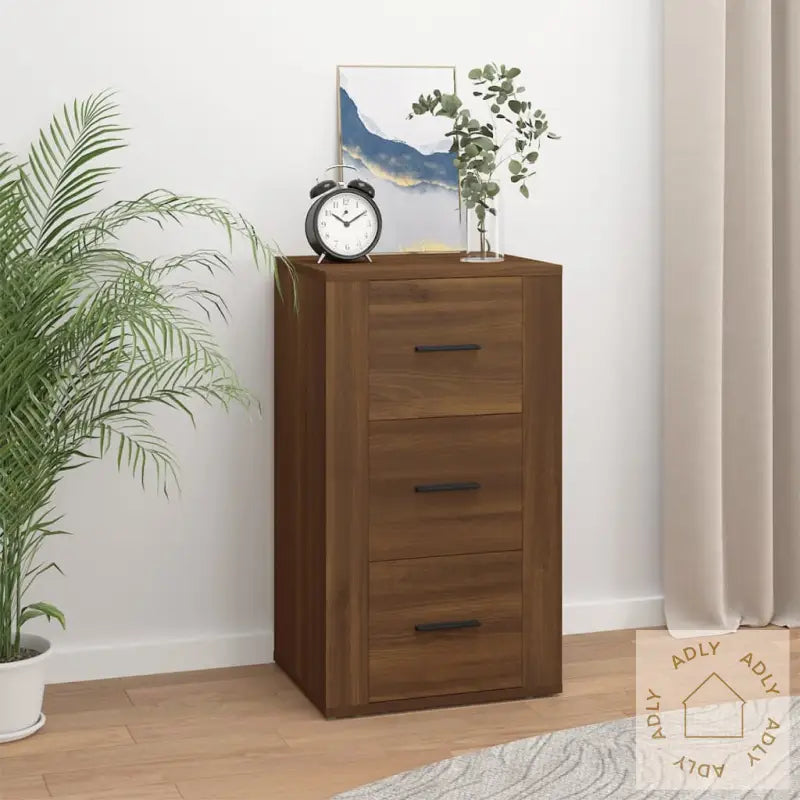 Slitesterkt materiale: Skapet er laget av solid konstruert treverk av høy kvalitet. Dette gir ikke bare et glatt og moderne utseende, men gjør også møbelet motstandsdyktig mot fuktighet, noe som er en fordel for møbler som skal vare lenge.Tilstrekkelig lagringsplass: Med tre romslige skuffer sørger skjenken for god organisering og enkel tilgang til alt du trenger i hverdagen, enten det er dokumenter, tilbehør, klær eller andre småting. Det hjelper deg å holde rommet ryddig og oversiktlig.Robust topp: Øvre del av skjenken kan brukes til å sette frem dekorasjoner, bilder eller blomster, slik at du enkelt kan sette ditt eget preg på rommet og gjøre hjemmet mer innbydende. Den solide toppen tåler vekten av pyntegjenstander og gir et ekstra utstillingsområde i stilen brun eik.Advarsel: