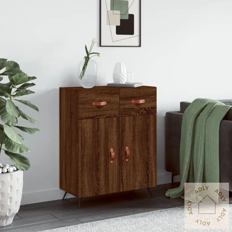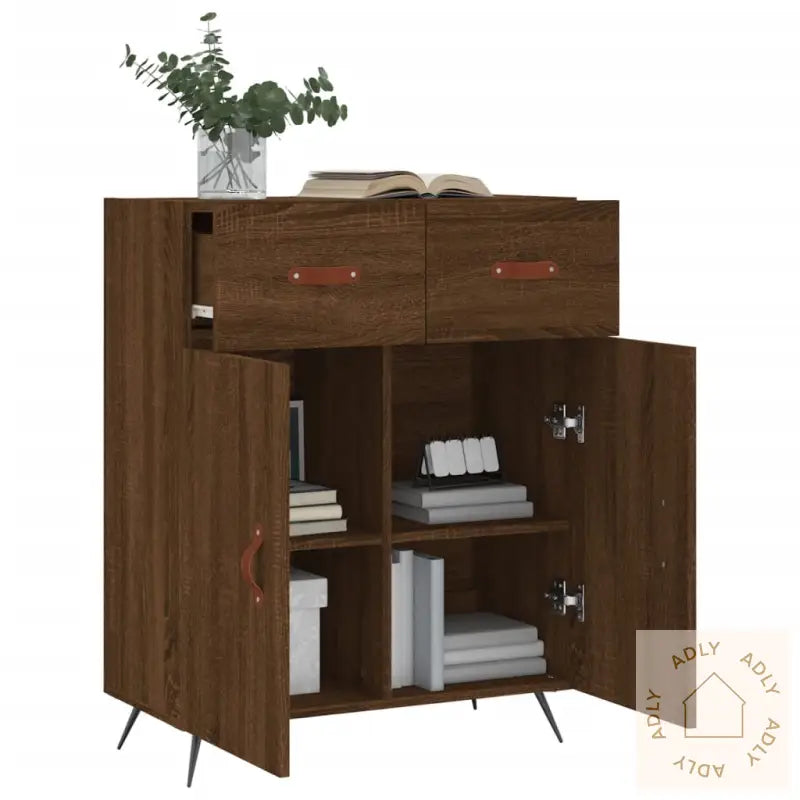 Denne moderne skjenken av tre med et tidløst uttrykk passer perfekt som en del av dine møbler til hjemmet. Den kommer i en stilig brun eik-farge, noe som gjør den enkel å kombinere med både eksisterende hagemøbler, bokhyller og stående hyller.