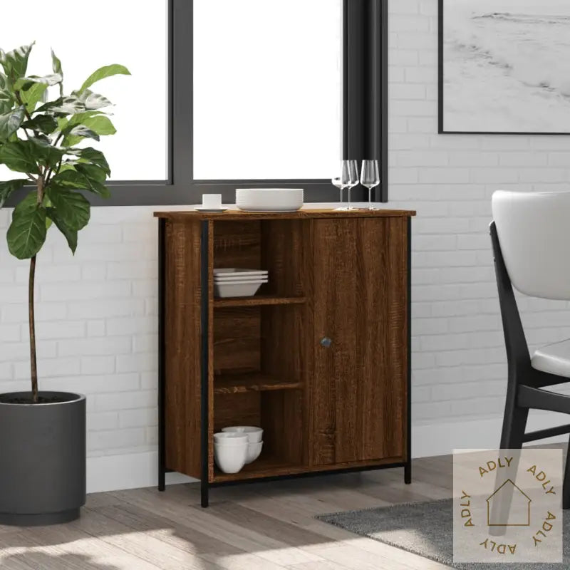 Slitesterkt materiale: Skjenken er laget av konstruert tre med en jevn, robust overflate som tåler daglig bruk. Dette gir ikke bare styrke og stabilitet, men gjør også at møbelet er motstandsdyktig mot fuktighet. Materialet er lett å holde rent – du tørker bare over med en fuktig klut når det trengs.Rikelig med lagringsplass: Med god plass bak dørene får du oversikt og orden på alt fra servise og pynteting til småting du bruker hver dag. Det store innvendige rommet gjør det enkelt å holde alt organisert og lett tilgjengelig.Solid topp: Toppen på oppbevaringsskapet er stødig og egner seg perfekt til å vise fram favorittdekorene dine, enten det er fotorammer, potteplanter eller andre pyntegjenstander. Den solide toppen gir deg ekstra funksjonalitet og lar deg utnytte møbelet som utstillingsplass.Justerbare føtter: Fire justerbare føtter i plast sørger for at skjenken står støtt, selv på litt ujevne gulv. De plastbelagte føttene gjør det dessuten enklere å beskytte gulvet mot riper og øker stabiliteten.Advarsel: