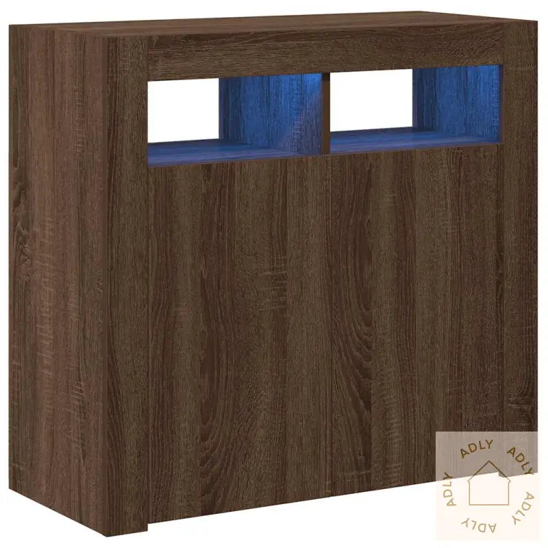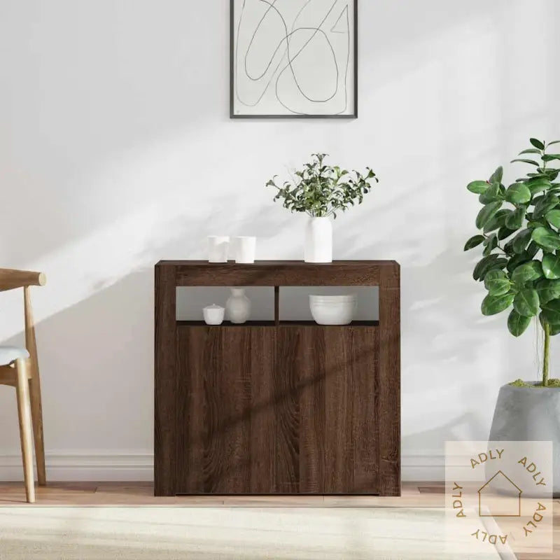 Praktisk materiale: Skjenken er laget av konstruert treverk i brun eik, som har en jevn overflate og er kjent for sin styrke, stabilitet og fuktmotstand. Materialet gjør den både slitesterk og enkel å rengjøre—perfekt for en travel hverdag.Rikelig med oppbevaringsplass: Det innvendige oppbevaringsrommet hjelper deg med å holde orden i hjemmet, enten det er stuen, gangen eller et soverom som trenger ekstra plass til tingene dine.RGB LED-lys: Denne moderne skjenken har innebygde RGB LED-lys med flere innstillinger, slik at du enkelt kan endre fargen på lyset etter humør eller anledning. Lysene bidrar til et trendy preg og fremhever den stilrene looken til dette møbelet.Stilig utseende: Skjenkens rene linjer og elegante design i brun eik gir den et tidløst uttrykk som matcher de fleste interiørstiler. Dette gjør at den lett passer inn sammen med annen dekor eller for eksempel hagemøbler som flyttes inn om vinteren.Advarsel: