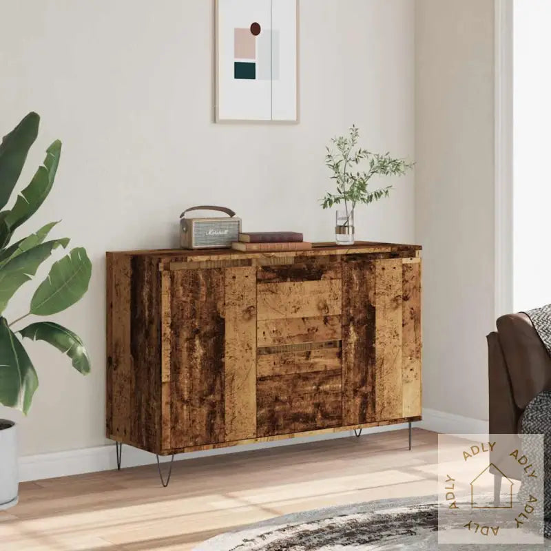 Slitesterkt materiale: Skapet er laget av konstruert treverk, kjent for sin høye kvalitet og jevne overflate. Dette gjør det ikke bare robust og stabilt over tid, men også motstandsdyktig mot fuktighet – noe som betyr at denne skjenken holder seg pen lenger i norske hjem. Den er i tillegg enkel å holde ren – bare tørk av med en fuktig klut.Rikelig med lagringsplass: Buffetskapet gir deg god plass til å oppbevare det du trenger i hverdagen, slik som servise, bøker, eller småting du vil ha lett tilgjengelig. Det hjelper deg å holde stuen eller spisestua ryddig og organisert, samtidig som alt er innen rekkevidde.Visningsfunksjon: Toppen av skjenken kan brukes til å vise frem dine favorittdekorasjoner - alt fra bilderammer og potteplanter til personlige suvenirer. Den løfter virkelig rommet ved å gi deg muligheten til å sette ditt eget preg på innredningen.Jernben: De solide jernbena sørger for at skjenken står stødig på alle typer gulv og gir ekstra holdbarhet. Dette gir deg en ekstra trygghet når du bruker skjenken til ulike ting hjemme.Advarsel: