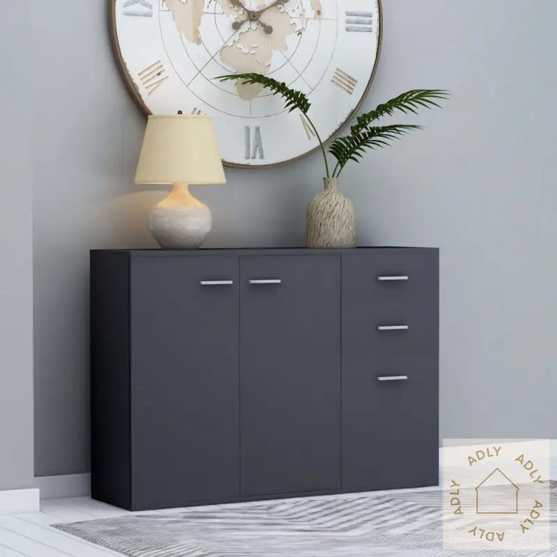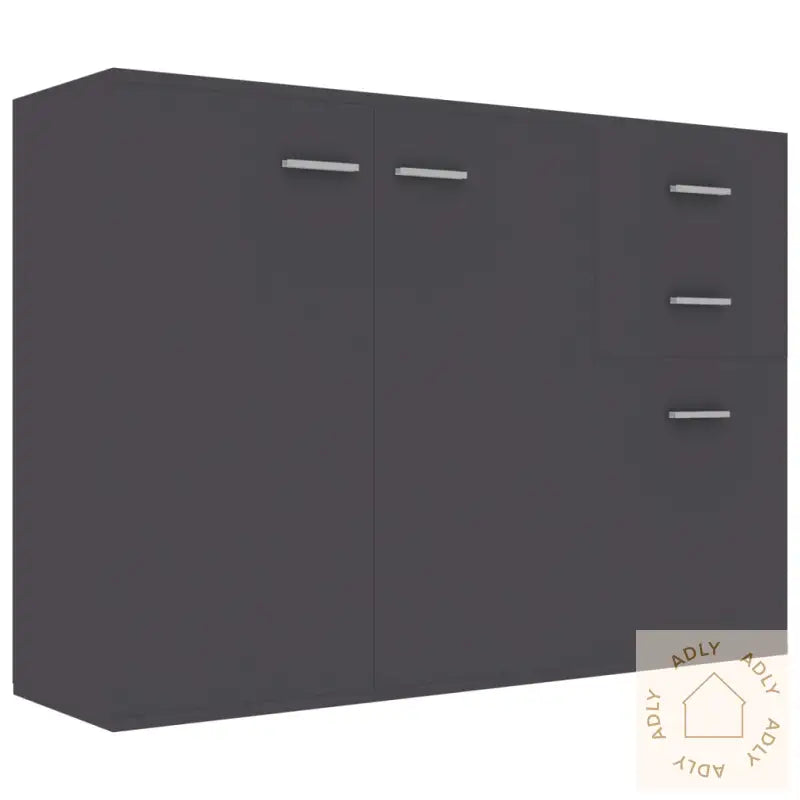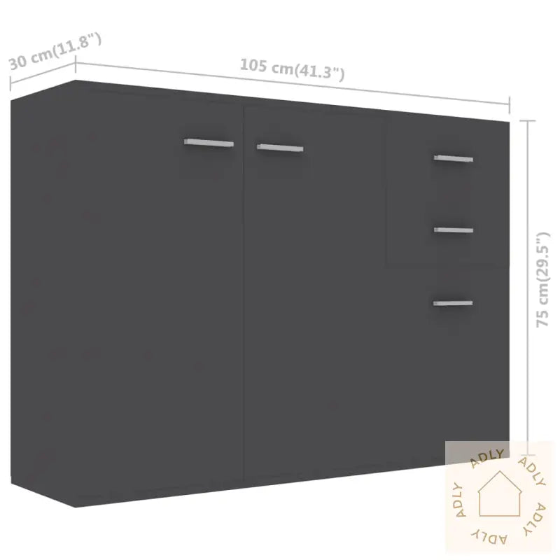 Farge: gråMateriale: konstruert treMål: 105 x 30 x 75 cm (L x B x H)Med 3 dører og 2 skufferMontering kreves: jaADVARSEL: For å forhindre at det velter må dette produktet brukes med den medfølgende festeanordningen.Vennligst merk: Skrue(r) og plugg(er) for innsiden av veggen er ikke inkludert. Finn og bruk skru(er) og plugg(er) som passer for veggene dine. Hvis du er usikker, søk profesjonelle råd. Les og følg hvert trinn i instruksjonen nøye.