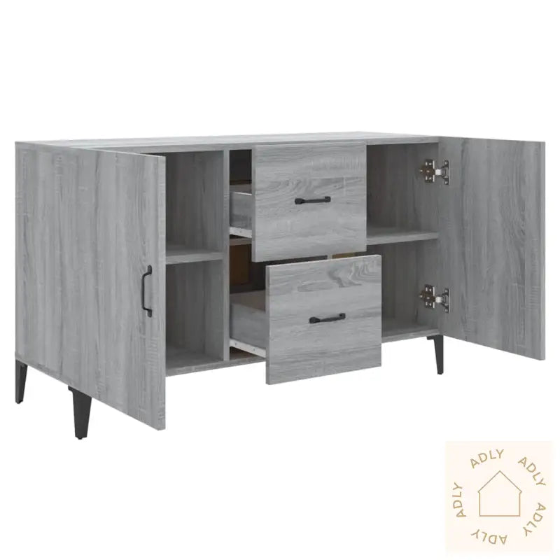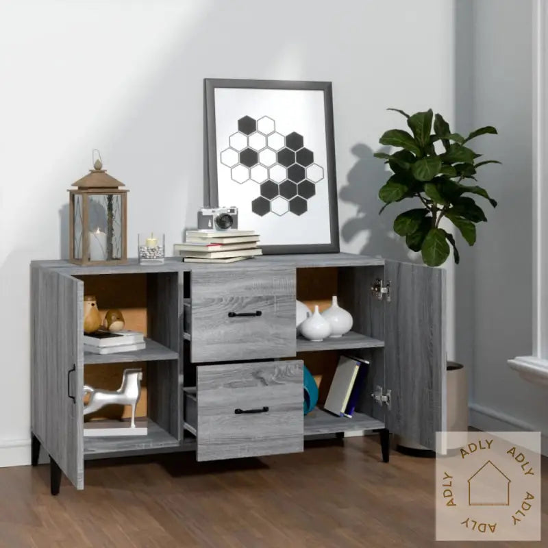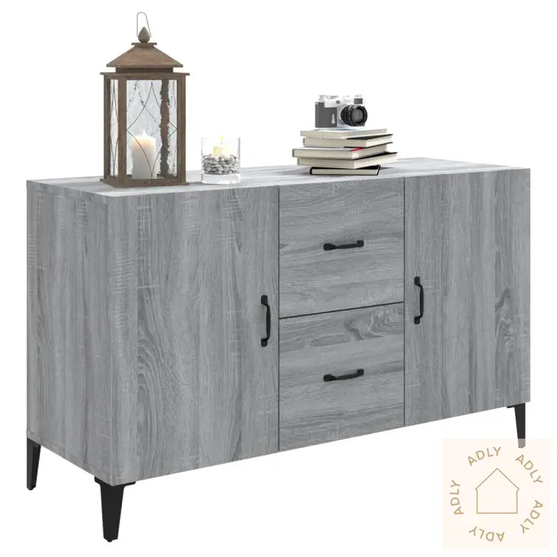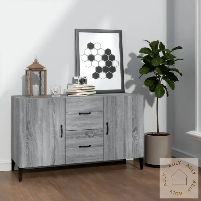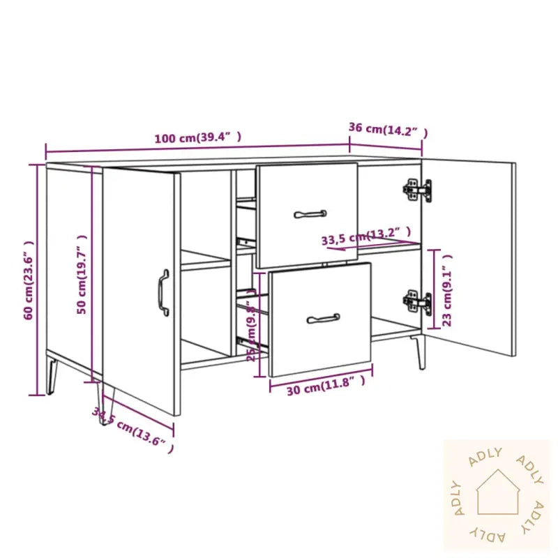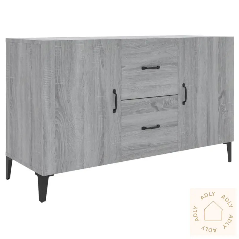 Premium materiale: Skjenken er produsert i konstruert treverk av eksepsjonell kvalitet med en jevn, fin finish. Dette materialet gir styrke, god stabilitet og høy motstandsevne mot fukt, noe som gjør møblene slitesterke og egnet for daglig bruk.Rikelig med oppbevaring: Sideskapet er utstyrt med to dører og to praktiske skuffer, ideelle for å holde alt fra servise og bestikk til andre daglige nødvendigheter ryddig og organisert. Den romslige toppen passer perfekt til å fremheve pyntegjenstander, bilder eller planter, slik at du kan personliggjøre hjemmet på din måte.Enkel rengjøring: Alle overflater kan enkelt tørkes over med en fuktig klut, så du slipper å bruke mye tid på vedlikehold, og skjenken beholder sitt flotte utseende lenge.Stilig design: Det elegante uttrykket gjør at denne skjenken enkelt kombineres med andre møbler og tilfører hjemmet ditt et preg av moderne sjarm. Stilig design passer like godt i stue, gang eller spisestue.Advarsel: