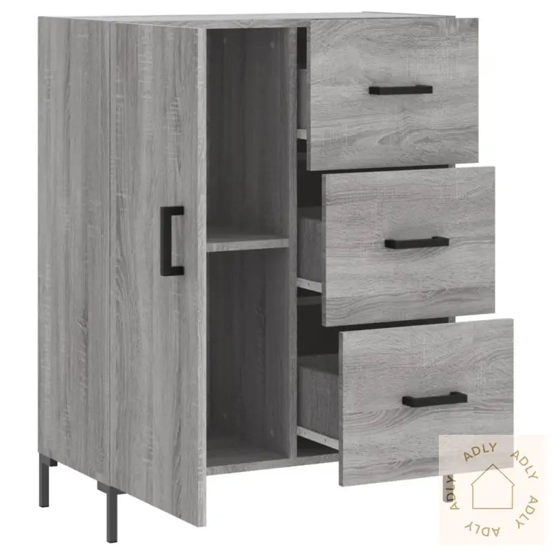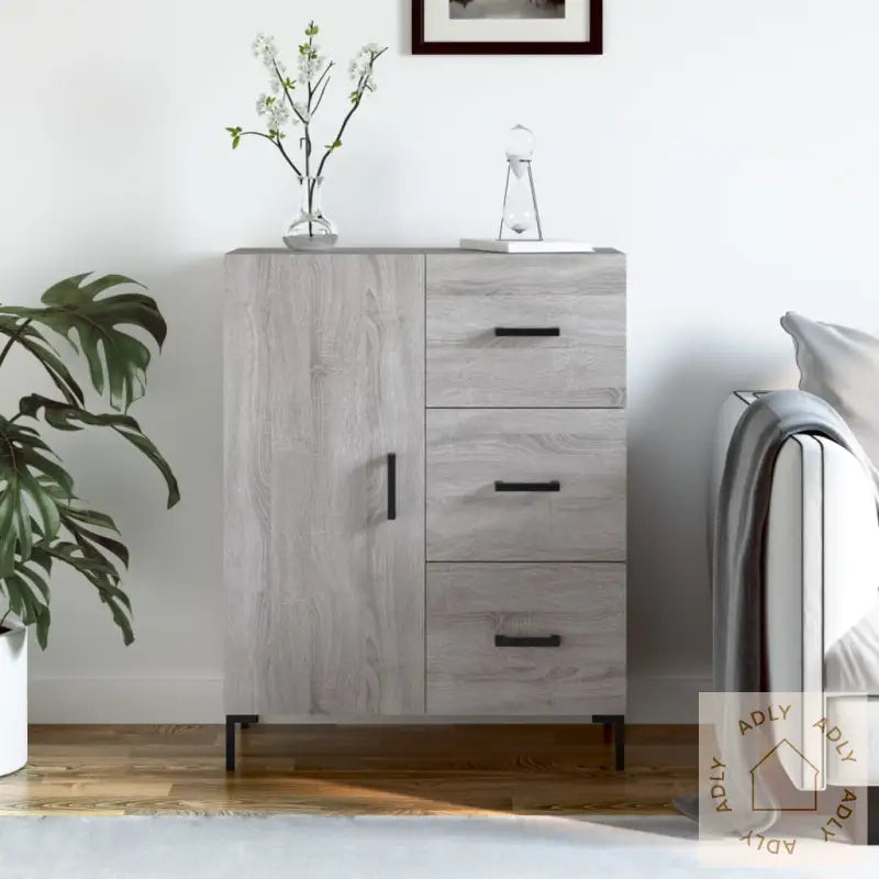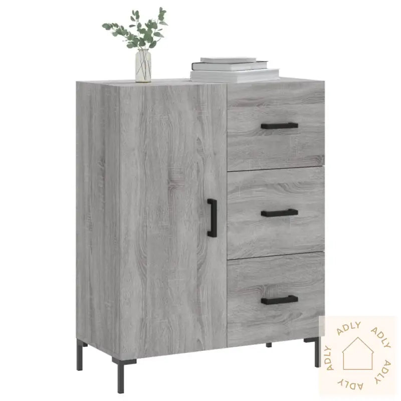 Solid materiale: Skjenken er laget av konstruert treverk i høy kvalitet, med en jevn og fin overflate. Dette gir god styrke, solid stabilitet og gjør møbelet motstandsdyktig mot fukt – perfekt for daglig bruk i hjemmet.Rikelig oppbevaring: Med tre romslige skuffer og to separate rom bak døren får du masse fleksibel lagringsplass. Her kan du holde alt fra servise til småting systematisk samlet og lett tilgjengelig, slik at det blir enklere å få et ryddig innemiljø.Utstillingsmulighet: Den solide toppdelen på skjenken er ideell for å sette frem favorittdekor, blomsterpotter eller familieportretter. Det gir deg muligheten til å personliggjøre interiøret og skape et varmt samlingspunkt ved siden av dine andre møbler.Praktisk dør: Oppbevar det du ønsker skjult eller ekstra beskyttet mot støv og lys, bak skapdøren. Dette bidrar samtidig til et mer ryddig og ordnet uttrykk i rommet.Moderne metallføtter: De stilrene metallføttene gir et nett, moderne uttrykk og sørger samtidig for god stabilitet. Passer flott sammen med ulike møbler til hjemmet, også sammen med utendørs- eller hagemøbler når du ønsker en gjennomført stil.Advarsel: