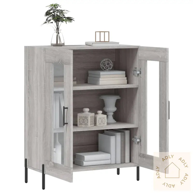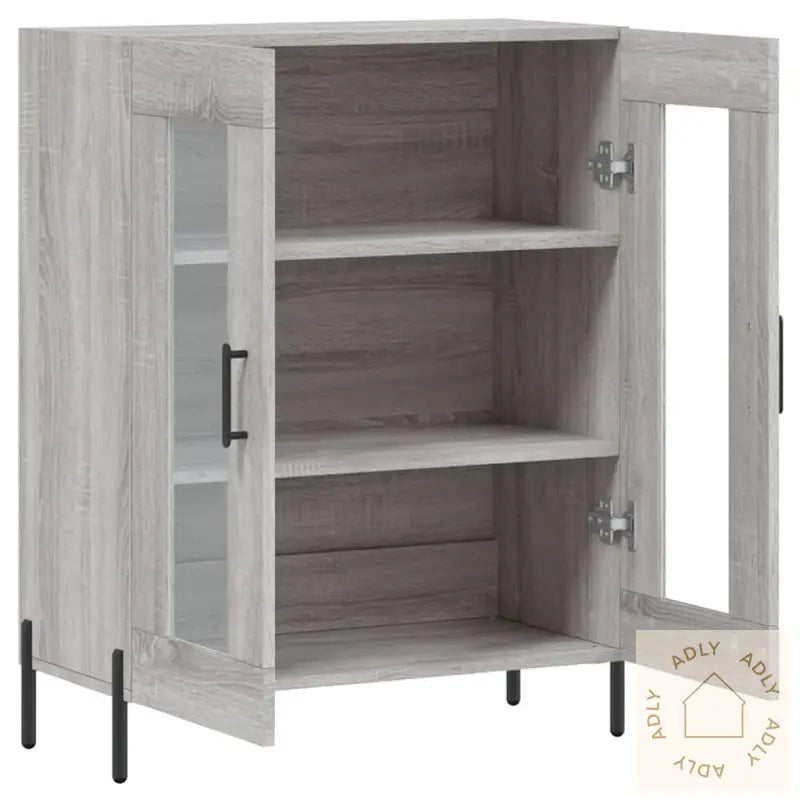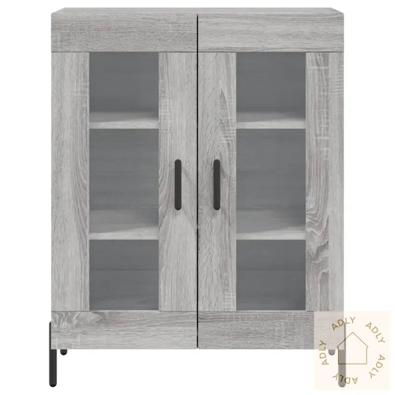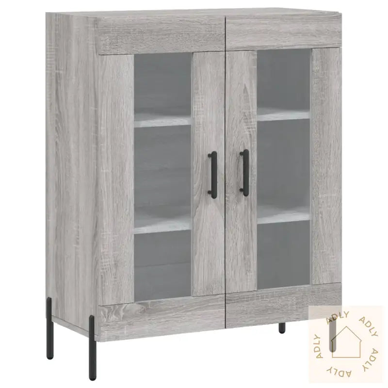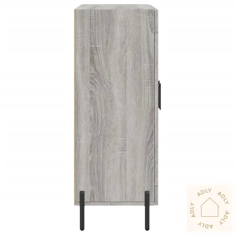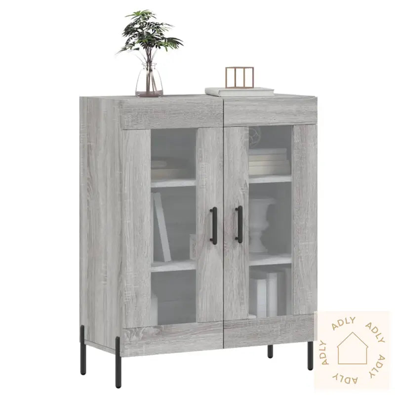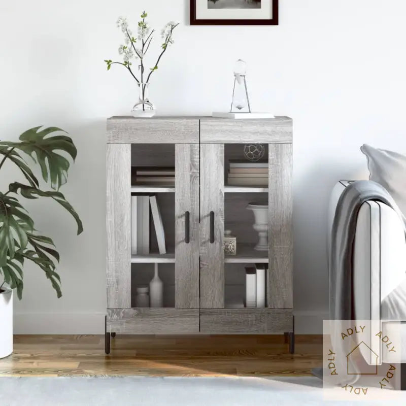 Slitesterkt materiale: Skapet er laget av konstruert tre, med en særpreget grå sonoma-finish som gir et moderne og elegant uttrykk. Det konstruerte treverket har en jevn overflate, er svært robust og motstandsdyktig mot fukt – perfekt for daglig bruk. I tillegg er det enkelt å holde rent; bare tørk over med en fuktig klut.Rikelig med lagringsplass: Skjenken har god plass til å organisere alt fra servise og bøker til småelektronikk og andre nødvendigheter. På den måten får du orden på tingene dine, og enkelt tilgang til det du trenger i hverdagen.Visningsfunksjon: Topplaten på skapet er ideell for å vise frem personlige gjenstander; enten du vil sette frem dekorative detaljer, fotoalbum eller grønne planter for å sette et personlig preg på rommet. Dette gjør skjenken til mer enn bare et oppbevaringsmøbel - det blir også et flott innslag i interiøret.Jernføtter: De solide jernføttene gir skapet ekstra stabilitet og en avslappet stil, samtidig som de beskytter gulvet ditt og forlenger levetiden på møbelet.Advarsel: